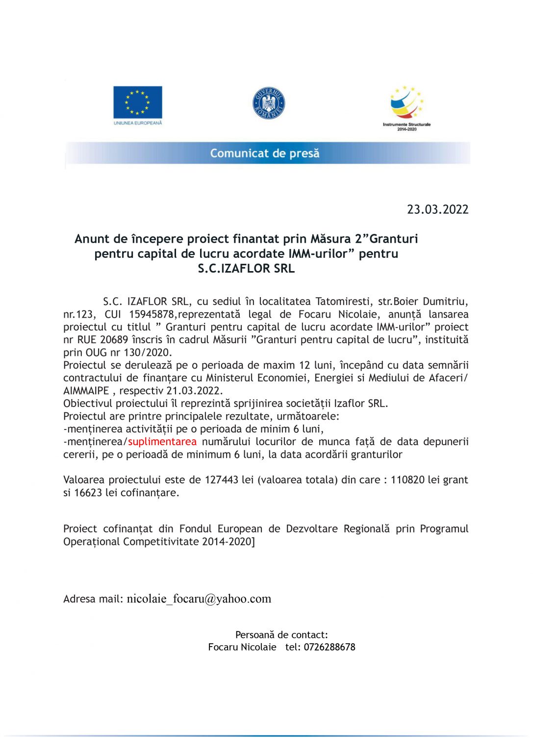 EconomieAnunț de începere proiect finanțat prin Măsura 2 „Granturi pentru capital de lucru acordate IMM-urilor” pentru S.C. IZAFLOR SRL Jurnalul Olteniei 23 martie 2022 Share SHARE Jurnalul Olteniei See Full Bio TAGGED:finantaregranturiimmproiect Distribuie acest articol Facebook Whatsapp Whatsapp Email Copy Link Print Articolul precedent Oficialii vâlceni, întâlnire cu constructorul secțiunii Boița – Cornetu a Autostrăzii A1 Articolul următor Ministrul rus al Apărării a dispărut Ultima ora ANUNT PRIVIND ORGANIZAREA ACHIZITIEI DE UTILAJE . MINIEXCAVATOR – LOTUL 1, UTILAJ DE FORAT HIDRAULIC – LOTUL 2 – RELUATÃ 2 5 decembrie 2025 Modernizarea CF Filiași: Începe proiectarea 5 decembrie 2025 Testare gratuită HPV la Spitalul Județean Târgu Jiu 5 decembrie 2025 CE Oltenia raportează emisii scăzute de dioxid de carbon 5 decembrie 2025 DIICOT a destructurat un grup de proxenetism în Mehedinți 5 decembrie 2025 Legea pensiilor magistraților, atacată, din nou, la CCR 5 decembrie 2025 Magia Crăciunului Târgu Jiu: Seară de neuitat 5 decembrie 2025 A dat bancnote false cu „Prop Copy”: Percheziții în Mehedinți 5 decembrie 2025 Căprioare și ponei, de Crăciun, în Parcul Romanescu 5 decembrie 2025 Gorj: agresori reținuți și monitorizați electronic 5 decembrie 2025