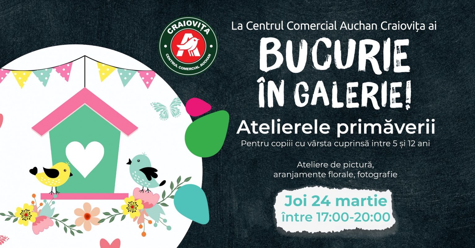 Așadar, joi 24 martie, de la ora 17.00 îi așteptăm pe copii la „Atelierele Primăverii”, în Galeria Centrului Comercial Auchan Craiovița. Participarea este gratuită, în limita locurilor disponibile în momentul sosirii.