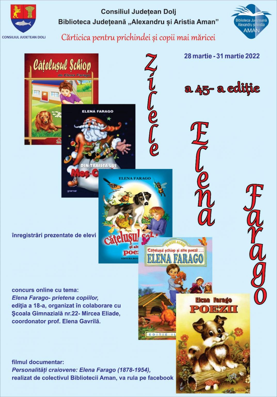 „Poeziile Elenei Farago, cunoscută ca „poeta copiilor”, vor fi puse în valoare, în aceste zile, prin mai multe activități în care sunt implicați elevii și preșcolarii de la instituțiile de învățământ partenere în proiectele Bibliotecii Județene „Alexandru și Aristia Aman”. La Casa Memorială „Elena Farago” vom primi, ca în fiecare an, vizitele școlarilor și preșcolarilor, însoțiți de cadre didactice. Elevii de la Școala Gimnazială nr. 22 „Mircea Eliade” Craiova, coordonați de prof. Elena Gavrilă, vor participa la un concurs online de recitat poezii, intitulat „Elena Farago – prietena copiilor”, concurs aflat la cea de-a 18-a ediție.De asemenea, pe pagina de facebook a Bibliotecii Județene „Alexandru și Aristia Aman” vom prezenta, chiar pe 29 martie, ziua de naștere a poetei, un film documentar intitulat „Personalități craiovene: Elena Farago (1878-1954), realizat de colectivul Bibliotecii Aman. O altă activitatea prin care dorim să aducem un omagiu poetei copiilor este activitatea derulată în această săptămână în cadrul proiectului „Cărticica pentru prichindei și copii mai măricei”, intitulată „Elena Farago, prietena copiilor (recitare poezii)”, conform reprezentanților Bibliotecii „Aman”.