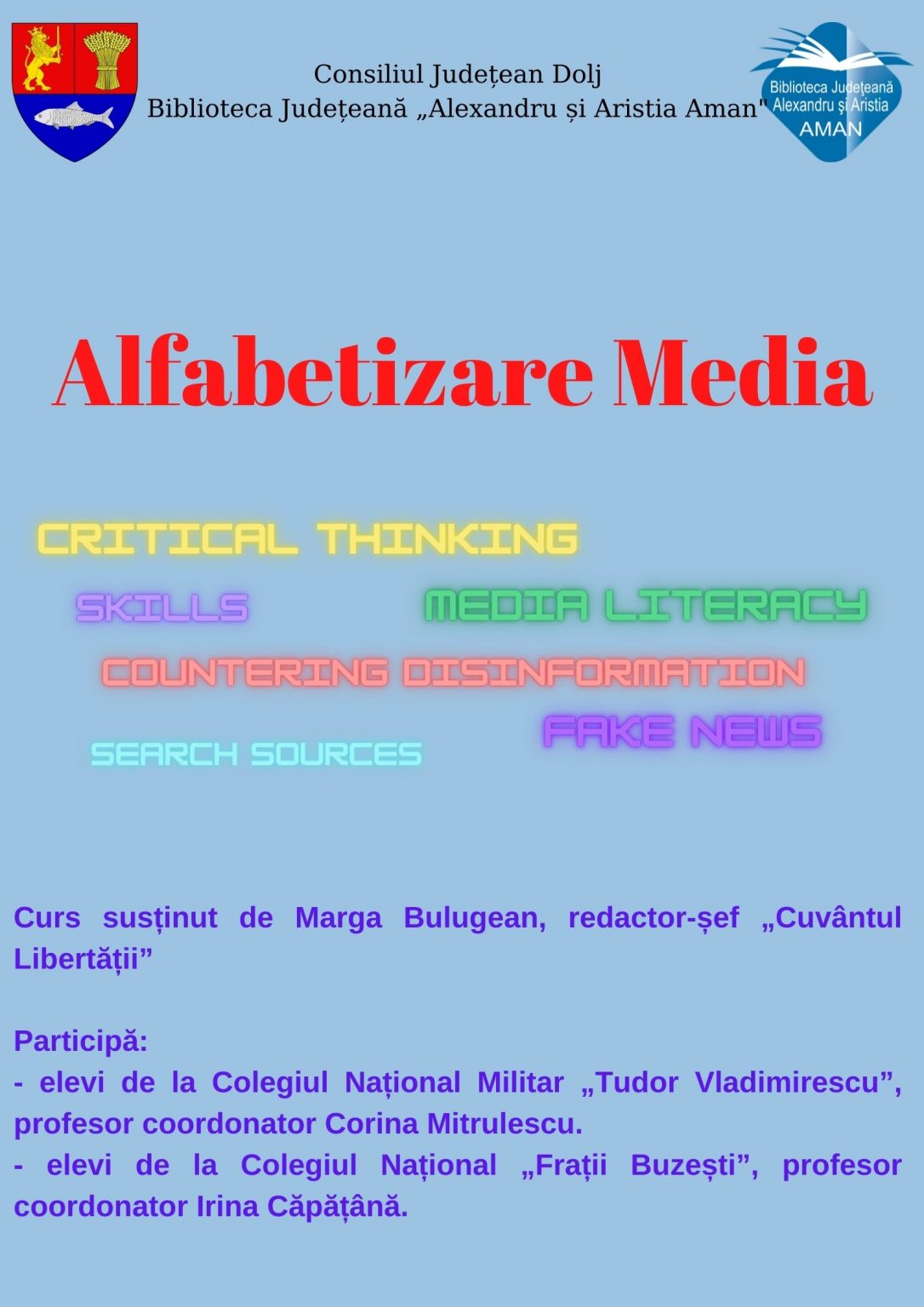 Biblioteca Județeană „Alexandru și Aristia Aman”, prin secția Mediatecă și American Corner Craiova, organizează începând cu data de 7 aprilie 2022, ora 16.00, o primă întâlnire în cadrul proiectului: „Alfabetizare Media”, desfășurat în parteneriat cu dna. Marga Bulugean, redactor-șef „Cuvântul Libertății”, alături de elevii clasei a IX-a de la Colegiul Național Militar „Tudor Vladimirescu”, coordonați de profesor Corina Mitrulescu.
