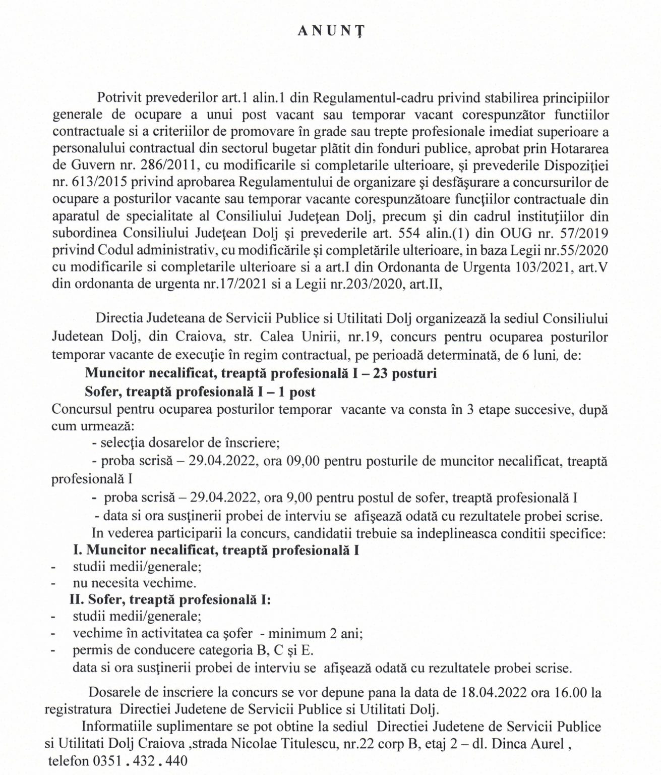 OlteniaAnunț organizare concurs pentru ocupare posturi vacante Jurnalul Olteniei 28 aprilie 2022 Share SHARE Jurnalul Olteniei See Full Bio Distribuie acest articol Facebook Whatsapp Whatsapp Email Copy Link Print Articolul precedent România, locul I la Olimpiada Europeană de Matematică pentru Fete – EGMO 2022 Articolul următor UE dezbate al şaselea pachet de sancţiuni împotriva Rusiei Ultima ora Se știe grupa în care poate juca România la Cupa Mondială din 2026 5 decembrie 2025 Dolj: Ajutoare sociale de peste 76 milioane lei 5 decembrie 2025 Cea de-a VII-a ediție a Semimaratonului Craiovei a avut loc sâmbătă, 18 octombrie 2025. 5 decembrie 2025 ANUNT PRIVIND ORGANIZAREA ACHIZITIEI DE UTILAJE . MINIEXCAVATOR – LOTUL 1, UTILAJ DE FORAT HIDRAULIC – LOTUL 2 – RELUATÃ 2 5 decembrie 2025 Modernizarea CF Filiași: Începe proiectarea 5 decembrie 2025 Testare gratuită HPV la Spitalul Județean Târgu Jiu 5 decembrie 2025 CE Oltenia raportează emisii scăzute de dioxid de carbon 5 decembrie 2025 DIICOT a destructurat un grup de proxenetism în Mehedinți 5 decembrie 2025 Legea pensiilor magistraților, atacată, din nou, la CCR 5 decembrie 2025 Magia Crăciunului Târgu Jiu: Seară de neuitat 5 decembrie 2025