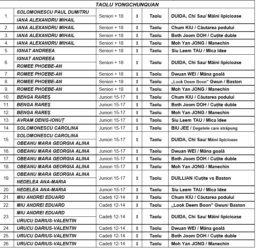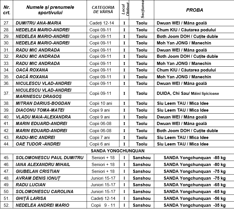 Practicanții de wushu kung-fu din clubul craiovean WU QUAN-LI „Forta celor cinci pumni” au obțnut 52 Medalii de aur, 22 Medalii de argint și 23 Medalii de bronz la Campionatul Național de YONGCHUNQUAN.
