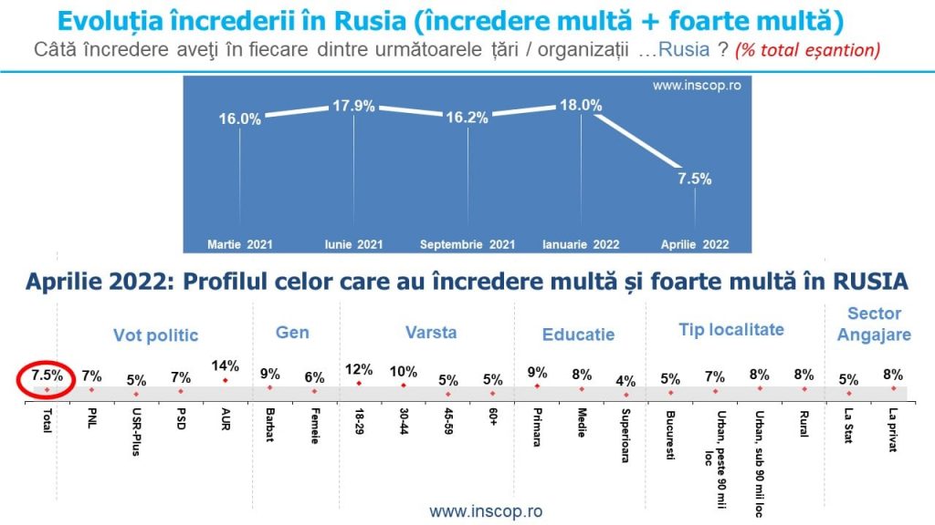 „În ceea ce privește profilul celor care mai au încredere multă și foarte multă în Rusia, se remarcă procente ceva mai mari de încredere în rândul votanților AUR, și la nivelul populației tinere (18-29 în special) care și înainte de război a fost ceva mai expusă la propagandă rusă.