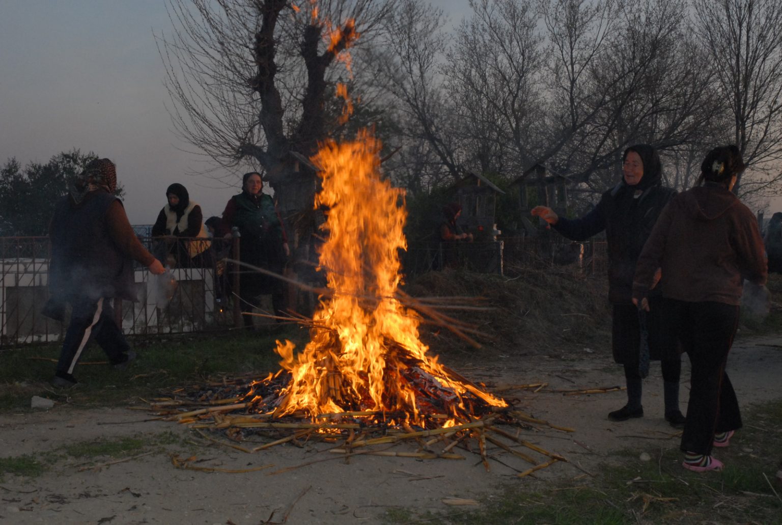 Tot de la ea aflăm că, întrucât la Joia Mare, când sosesc morţii, nu este atât de cald, se aprind focuri pentru fiecare mort, în curţile sau grădinile caselor, pe mormânt sau lângă mormânt, sau pentru toţi morţii laolaltă, în curtea bisericii sau la cimitir. „Focurile morţilor” încearcă să menţină un echilibru între lumea celor vii şi lumea celor morţi; focurile se aprind din lemnele unor arbori sacri, asociaţi cultului strămoşilor: „se foloseşte bozul uscat, lemnul de alun, rupte cu mâna şi nu tăiate cu securea…”.
