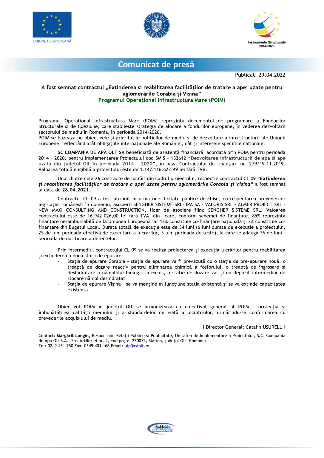 EconomieA fost semnat contractul „Extinderea și reabilitarea facilităților de tratare a apei uzate pentru aglomerările Corabia și Vișina”. Programul Operațional Infrastructura Mare (POIM) Jurnalul Olteniei 6 decembrie 2022 Share SHARE Jurnalul Olteniei See Full Bio TAGGED:apa uzatacontractcorabiaextinderefacilitatipoimreabilitaresemnaretratarevisina Distribuie acest articol Facebook Whatsapp Whatsapp Email Copy Link Print Articolul precedent Audi şi Porsche au decis să intre în Formula 1 Articolul următor ANAF a publicat lista datornicilor pentru primul trimestru al anului 2022 Ultima ora Gorj: agresori reținuți și monitorizați electronic 5 decembrie 2025 Suspect de tentativă de agresiune reținut de Poliția Dolj 5 decembrie 2025 Locuință din Gorj cuprinsă de flăcări 5 decembrie 2025 Distribuție Oltenia: Oltenii, mai interesați de energie și sustenabilitate 5 decembrie 2025 Semimaratonul Craiovei 2025: Record de participanți 5 decembrie 2025 Sancțiuni de peste 40.000 lei și o activitate suspendată la Băbeni 5 decembrie 2025 Oltenia, sub cod galben de vânt. Avertizare ANM 5 decembrie 2025 Lansare proiect: „Împădurirea unui teren agricol în comuna Dobrești, beneficiar SEINEA ILEANA-MIHAELA „ 5 decembrie 2025 Flăcări în toiul nopții la Berislăvești! Pompierii vâlceni au salvat locuința cuprinsă de incendiu 5 decembrie 2025 Un fost jucător de la Universitatea Craiova, inclus în echipa lunii noiembrie, în Liga 2 5 decembrie 2025