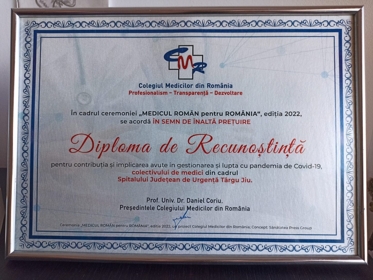 Colectivul de medici al Spitalului Județean de Urgență Târgu-Jiu a primit, din partea Colegiului Medicilor din România, o diplomă de recunoștință pentru contribuția și implicarea în gestionarea și lupta cu pandemia de Covid-19.