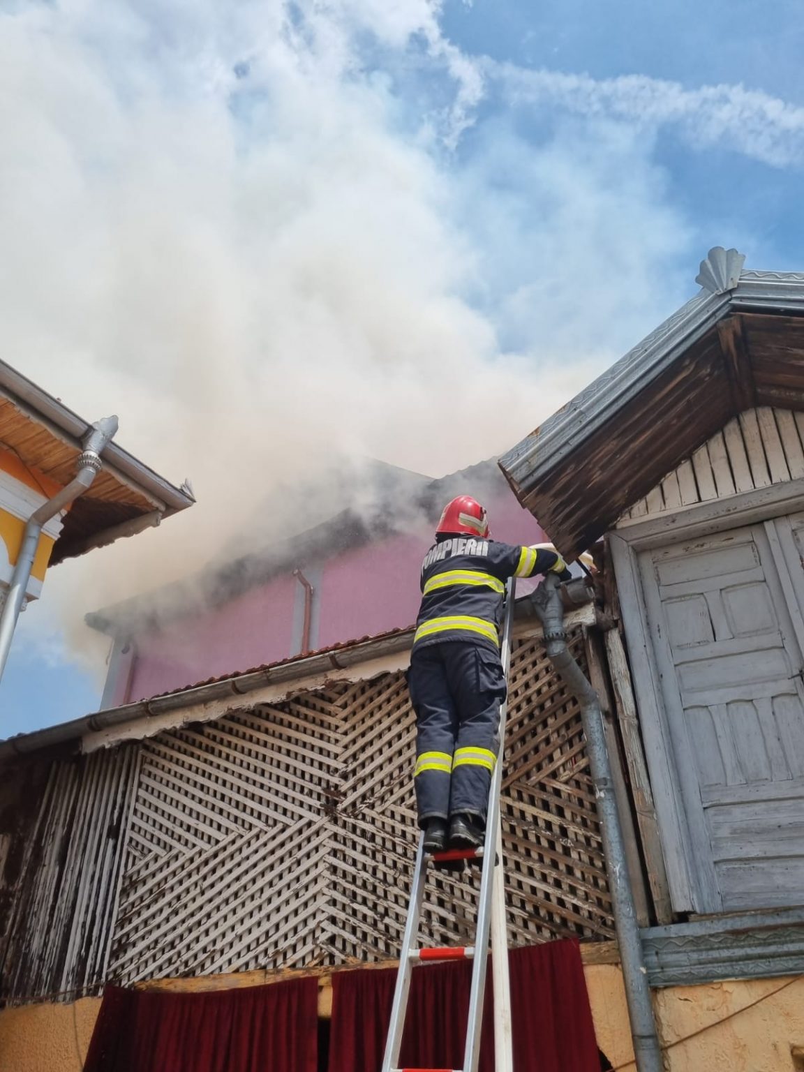 Update: Potrivit pompierilor, incendiul a fost lichidat, iar in urma acestuia au rezultat doar pagube materiale insemnate la nivelul etajelor 1 si 2. Acoperisul casei de locuit este distrus. Cauza probabila de izbucnire a incendiului fiind scurtcircuit electric.