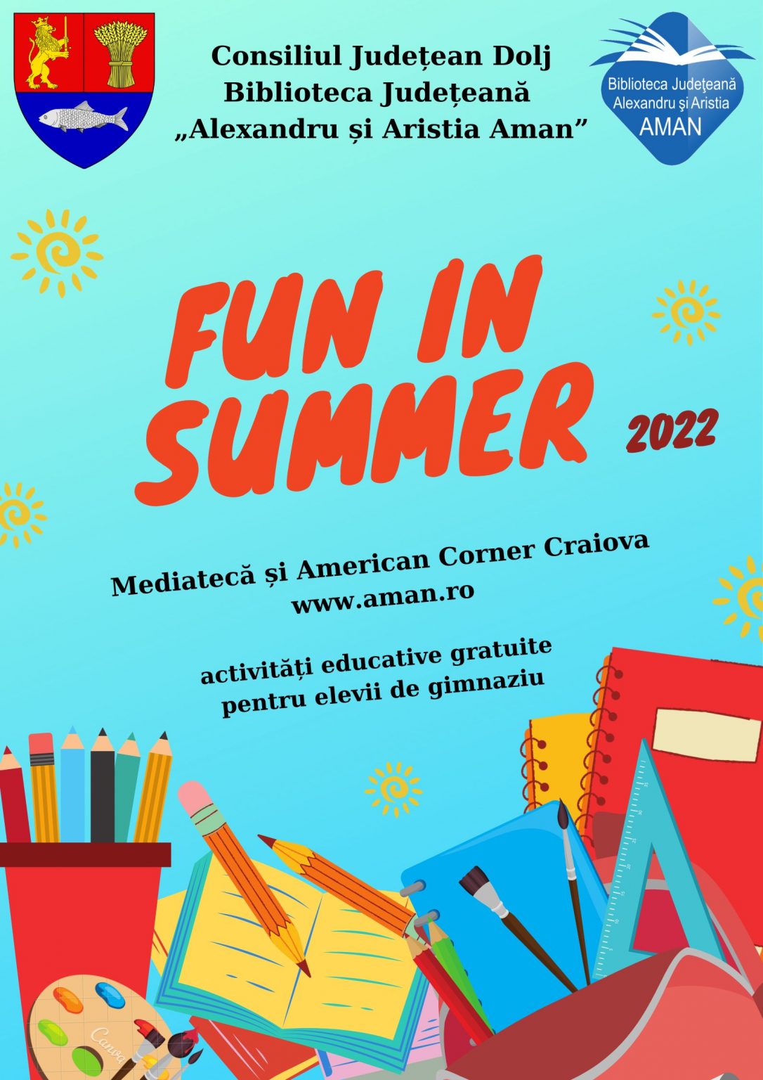 Biblioteca Județeană „Alexandru și Aristia Aman” organizează, în intervalul iulie-august 2022, proiectul educațional „Fun in Summer”. Ca și în anii precedenți, Fun in Summer cuprinde cursuri și ateliere gratuite desfășurate de bibliotecarele Mădălina Băileșteanu și Sofia Cercel, coordonatoare ale American Corner Craiova.