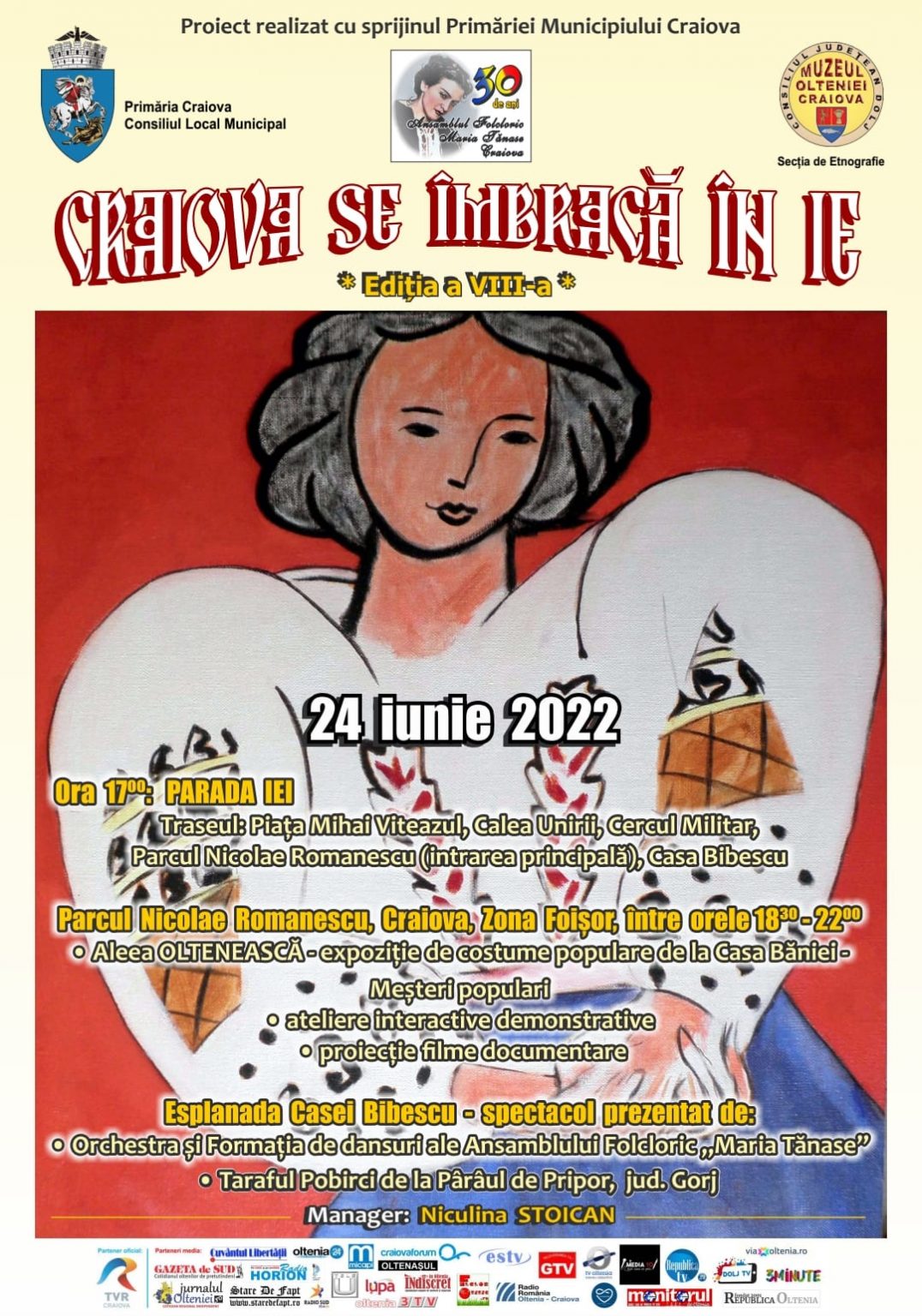 Cea de-a VIII-a ediție a evenimentului „Craiova se îmbracă în ie”, organizat sub egida Primăriei Craiova și cu susținerea Consiliului Județean Dolj, va aduce laolaltă meșteri creatori de cămăși cu altiță din toate zonele Olteniei, alături de meșteri practicanți de o întreagă varietate de elemente de patrimoniu cultural imaterial, astfel încât publicul craiovean va avea prilejul să admire, pe lângă costumele valoroase de sărbătoare, și tehnicile tradiționale de producere, țeserea la războiul de țesut, coaserea, ornamentarea cămășilor și altor piese de port, laolaltă cu alte tehnici de producere a unor elemente de patrimoniu cultural imaterial.