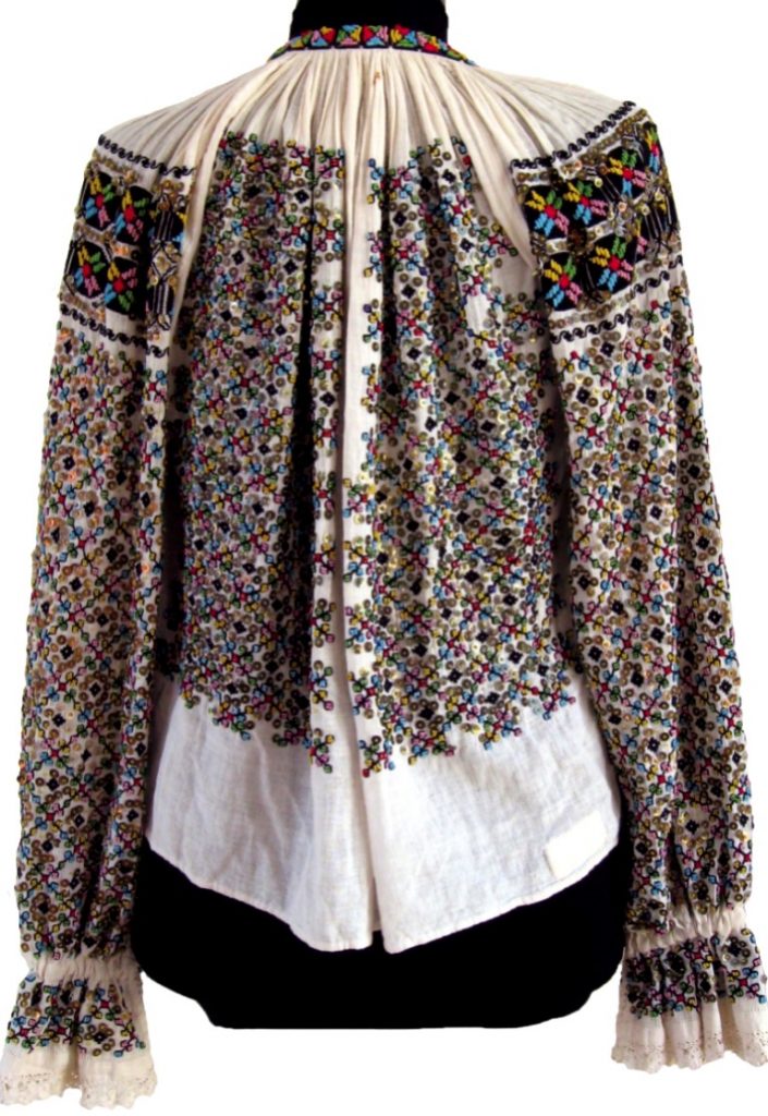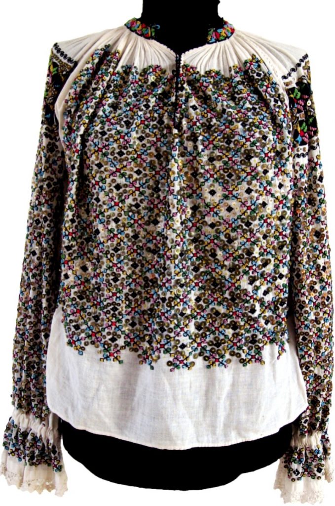 Cămașă femeiască sec. XX, încrețită la gât, bumbac, bentiță decorată compact cu arnici și mărgele multicolore, deschidere pe piept, motive decorative geometrice, roburi cusute cu arnici negru, încadrate cu mărgele și paiete cusute cu arnici negru, pe ambele fețe decor omogen, dispus în două registre, mâneci cu altiță și decor compact, motive florale și geometrice cusute cu arnici negru, paiete, mărgele multicolore: galben, verde, roz, bleumarin și roșu.