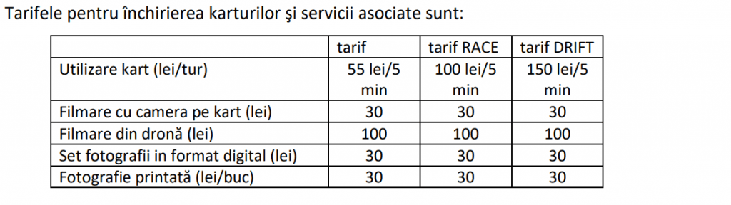 Pentru un tur simplu, care durează 5 minute, doritorii vor plăti nu mai puțin de 55 de lei. 100 de lei vor achita pentru 5 minute de RACE și 150 de lei pentru 5 minute de DRIFT. Tariful va fi redus pentru studenții și elevii care prezintă documentele justificative: legitimație, carnet.