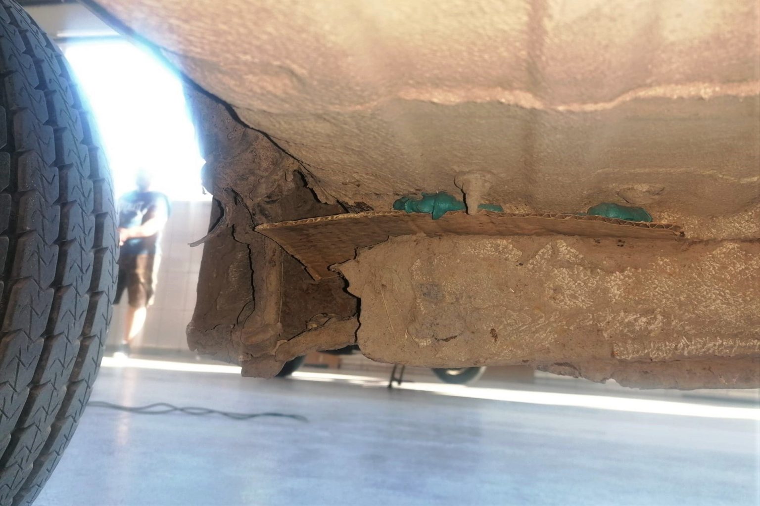 Proprietarul unei dube de pompe funebre și-a înlocuit scutul de protecție cu bucăți de carton, înainte să vină la Inspecția Tehnică Periodică.