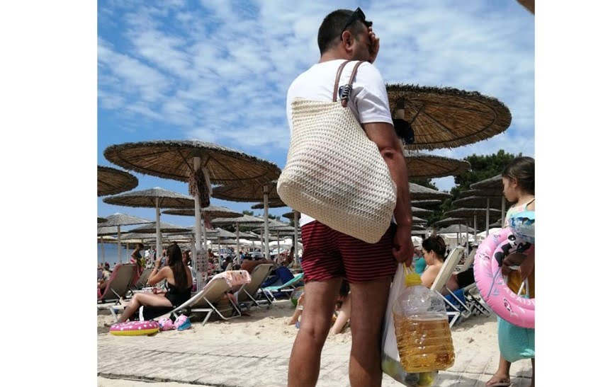 Un nou caz a apărut pe pagina Forum Thassos, de pe Facebook, unde a fost postată poza unui român pe plajă cu un bidon mare aproape plin cu vin.