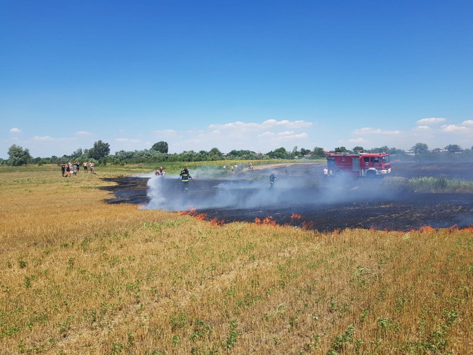 „Se intervine cu 3 autospeciale de lucru cu apă și spumă, din cadrul Detașamentului 2 de Pompieri Craiova in cooperare cu SVSU Teasc. În acest moment nu este pericol pentru case, iar circulația nu este afectată”, conform ISU Dolj.