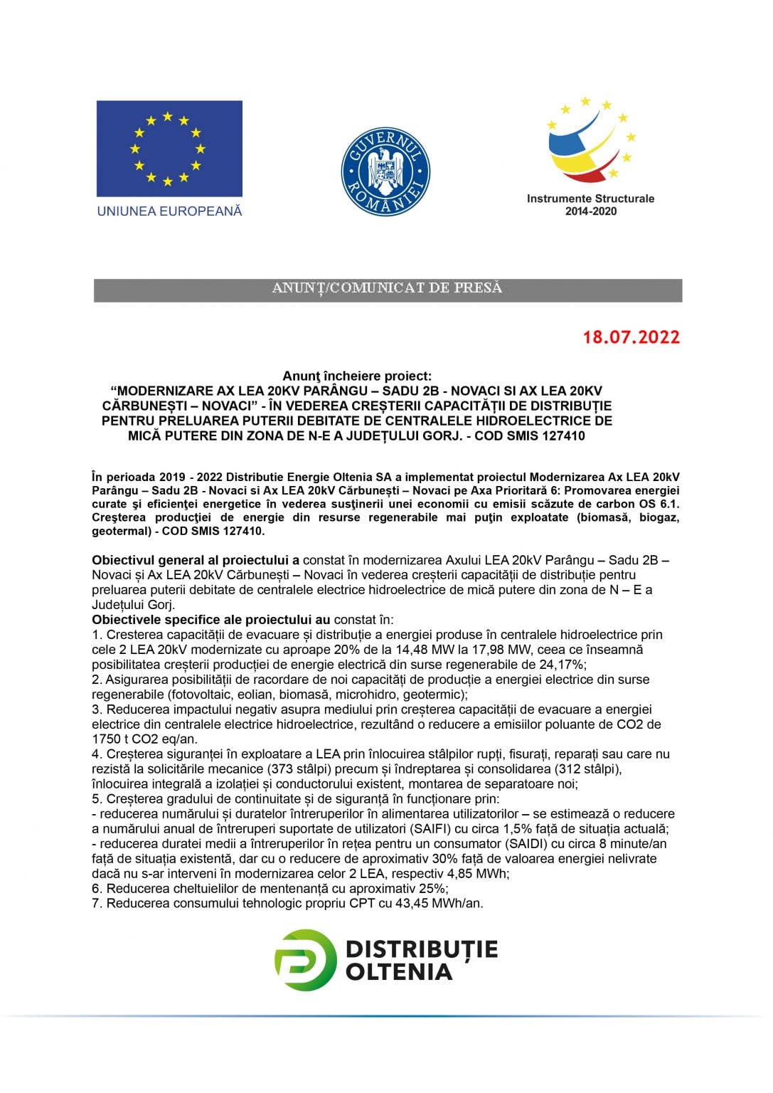 Anunţ încheiere proiect: „MODERNIZARE AX LEA 20KV PARÂNGU – SADU 2B – NOVACI SI AX LEA 20KV CĂRBUNEȘTI – NOVACI” – ÎN VEDEREA CREȘTERII CAPACITĂȚII DE DISTRIBUȚIE PENTRU PRELUAREA PUTERII DEBITATE DE CENTRALELE HIDROELECTRICE DE MICĂ PUTERE DIN ZONA DE N-E A JUDEȚULUI GORJ. – COD SMIS 127410