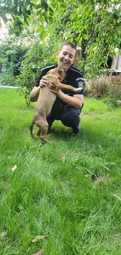 Astfel că, polițiștii au constatat că este vorba despre o femelă, de rasă metis-boxer, cu o vârstă de aproximativ 3 luni, de culoare maro, cu pete albe pe regiunea sternală și pe membre.