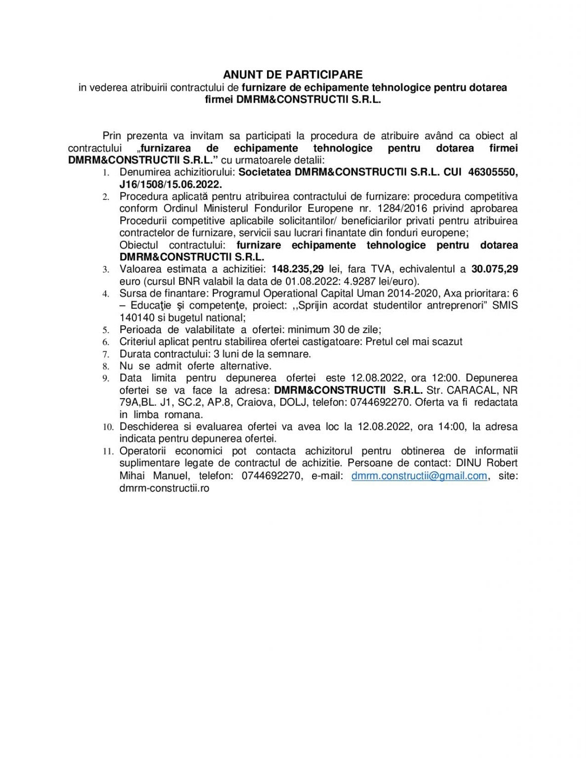 ActualitateEconomieOlteniaANUNT DE PARTICIPAREin vederea atribuirii contractului de furnizare de echipamente tehnologice pentru dotareafirmei DMRM&CONSTRUCTII S.R.L. Jurnalul Olteniei 8 august 2022 Share SHARE Jurnalul Olteniei See Full Bio Distribuie acest articol Facebook Whatsapp Whatsapp Email Copy Link Print Articolul precedent ANUNT DE PARTICIPAREin vederea atribuirii contractului de furnizare de echipamente tehnologice pentru dotarea firmei CRX AUTO CENTER S.R.L. Articolul următor Suporterii craioveni, evacuați şi reţinuţi în Polonia Ultima ora Spargere de sezon: doi doljeni au fugit cu sania! 6 decembrie 2025 Restricțiile de pe DN7, Viaductul Cârligul Mic, ridicate 6 decembrie 2025 Incendiu puternic în Malu Mare: Pompierii intervin 6 decembrie 2025 Scandal în Gorj: Doi tineri reținuți după o bătaie 6 decembrie 2025 Sfântul Nicolae: 800.000 de români sărbătoriți pe 6 decembrie 6 decembrie 2025 Zilele Colindului în România: Tradiția care unește țara 6 decembrie 2025 Se știe grupa în care poate juca România la Cupa Mondială din 2026 5 decembrie 2025 Dolj: Ajutoare sociale de peste 76 milioane lei 5 decembrie 2025 Cea de-a VII-a ediție a Semimaratonului Craiovei a avut loc sâmbătă, 18 octombrie 2025. 5 decembrie 2025 ANUNT PRIVIND ORGANIZAREA ACHIZITIEI DE UTILAJE . MINIEXCAVATOR – LOTUL 1, UTILAJ DE FORAT HIDRAULIC – LOTUL 2 – RELUATÃ 2 5 decembrie 2025