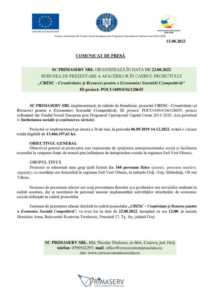 AnunturiOlteniaSC PRIMASERV SRL ORGANIZEAZĂ ÎN DATA DE 22.08.2022 SESIUNEA DE PREZENTARE A AFACERILOR ÎN CADRUL PROIECTULUI ,,CRESC – C(reativitate) și R(esurse) pentru o E(conomie) S(ocială) C(ompetitivă)” ID proiect: POCU/449/4/16/128655 Jurnalul Olteniei 21 iunie 2023 Share SHARE Jurnalul Olteniei See Full Bio Distribuie acest articol Facebook Whatsapp Whatsapp Email Copy Link Print Articolul precedent Aproximativ 1000 de absolvenți din județul Dolj, așteptați la examenul național de Bacalaureat, sesiunea august septembrie 2022 Articolul următor Incendiu pe Caracal. Trei oameni, la spital Ultima ora Investiție verde în Mehedinți: stop deșeurilor plutitoare 13 decembrie 2025 Parcări de reședință cu plată în Slatina: De ce s-a renunțat 13 decembrie 2025 Tragedie pe DN 65 lângă Slatina: Un tânăr de 19 ani a murit într-un grav accident 13 decembrie 2025 Salonul Anual de Artă 2025, eveniment major în Mehedinți 13 decembrie 2025 Ștefan Hrușcă vine în premieră la Târgul de Crăciun Craiova 13 decembrie 2025 Tragedie în Gorj: pieton ucis într-un accident violent 13 decembrie 2025 Protest la Craiova pentru justiție și împotriva corupției 12 decembrie 2025 Alertă alimentară: Lapte NAN Nestlé retras urgent din magazine 12 decembrie 2025 Cadouri cool de Crăciun pentru adolescenți 12 decembrie 2025 Satul oltenesc la Craiova. Tradiții de iarnă 12 decembrie 2025
