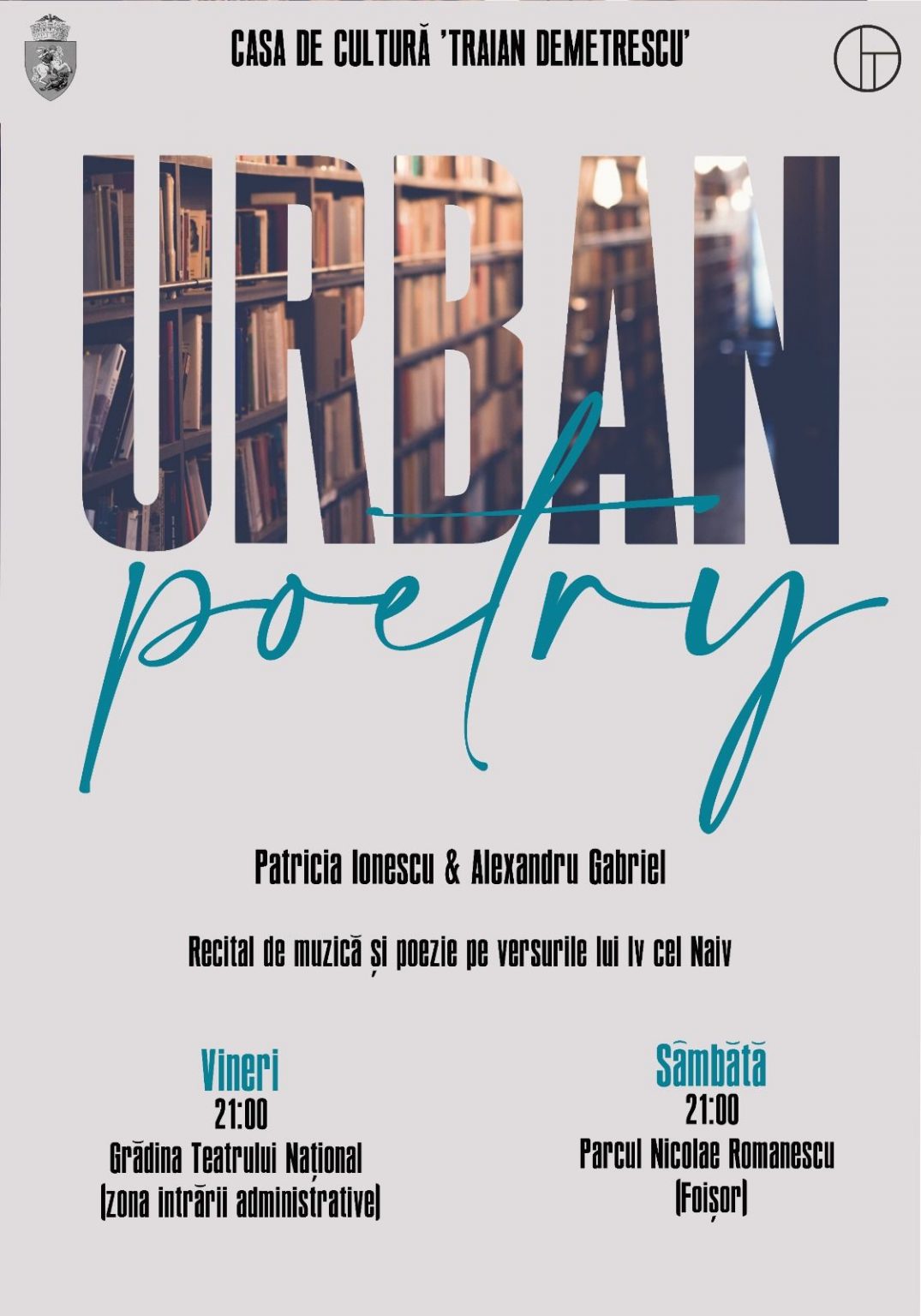 Casa de Cultură „Traian Demetrescu” (CCTD) organizează evenimentul Urban Poetry în zilele de 19 și 20 august. Craiovenii sunt invitați în grădina Teatrului Național și în Parcul Romanescu pentru a lua parte la recitaluri de muzică și poezie. Artiștii care vor delecta publicul sunt Patricia Ionescu și Alexandru Gabriel Boboruță.