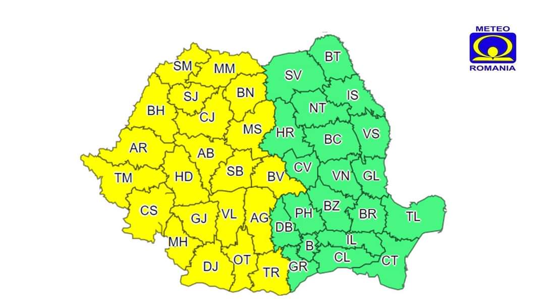 Mâine intră în vigoare un nou cod galben de ploi. Este valabil în perioada 20 august, ora 12:00 – 22 august, ora 10:00.