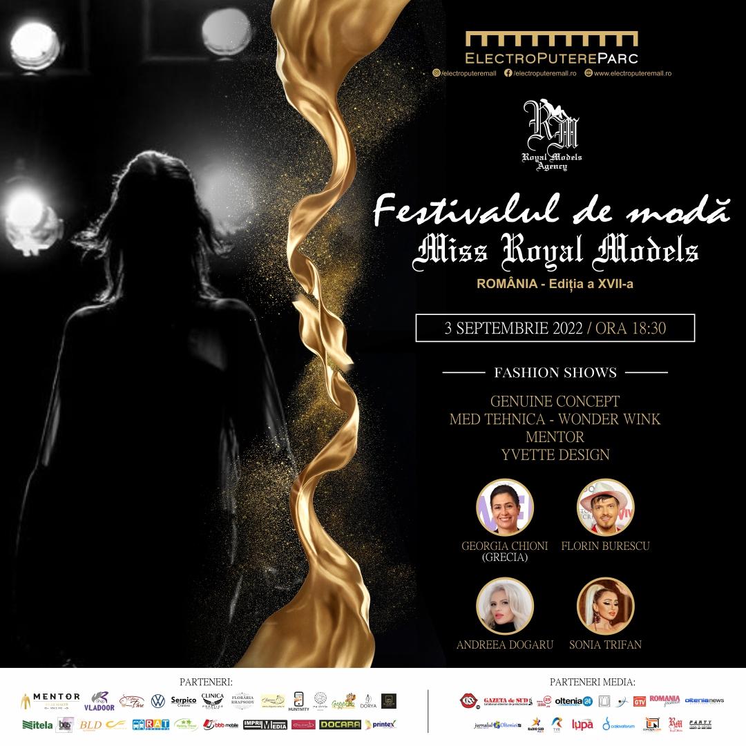 Royal Models Agency, în parteneriat cu Electroputere Mall, te invită la FESTIVALUL DE MODĂ Miss Royal Models ROMÂNIA, în data de 3 Septembrie 2022, începând cu ora 18:30, să descoperi tendințele fashion ale momentului, cele mai noi colecții de la designeri renumiți și debutanți, prezentări de modă inedite, piese vestimentare must have, dar și un regal de frumusețe feminină cuprins într-un concurs, în care 12 tinere modele din diferite orașe ale țării au oportunitatea de a-și prezența atuurile pentru câștigarea marelui titlu care va fi pe măsură acestui prestigios eveniment. Fii în pas cu modă!
