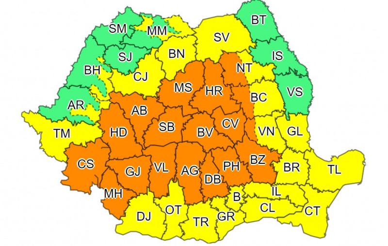 Potrivit meteorologilor, codul portocaliu de instabilitate vizează zonele montane, cea mai mare parte a Transilvaniei, sudul Banatului, nordul Olteniei și al Munteniei.