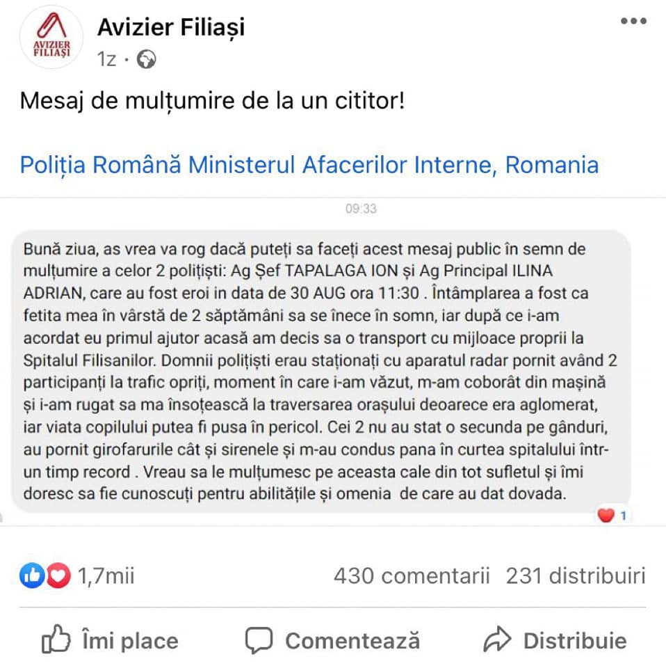 Ioan și Adrian nu s-au lăudat cu fapta lor. Pe pagina de Facebook “Avizier Filiași” tânăra mama a transmit mulțumiri colegilor noștri : “Vreau să le mulțumesc pe această cale din tot sufletul și îmi doresc să fie cunoscuți pentru abilitățile și omenia de care au dat dovadă” a scris aceasta, printr-un mesaj.