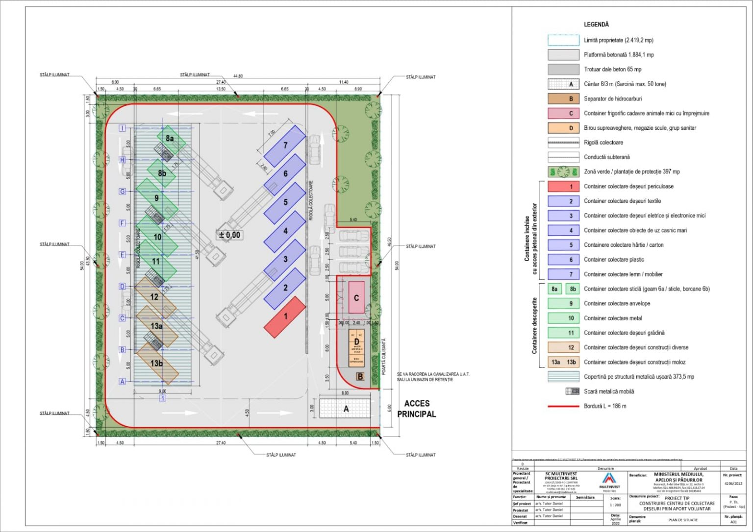 • Platformă carosabilă pentru amplasarea containerelor de tip ab-roll pentru deșeuri și circulația autoturismelor cetățenilor care aduc deșeuri;
