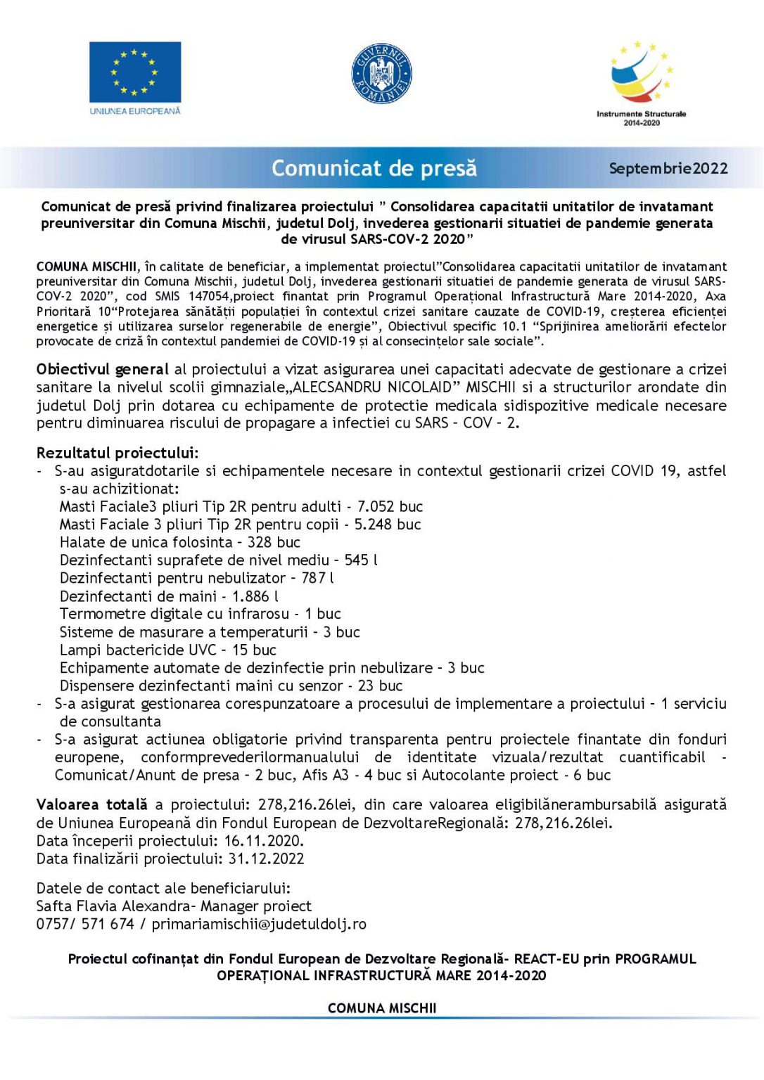 preuniversitar din Comuna Mischii, judetul Dolj, invederea gestionarii situatiei de pandemie generata