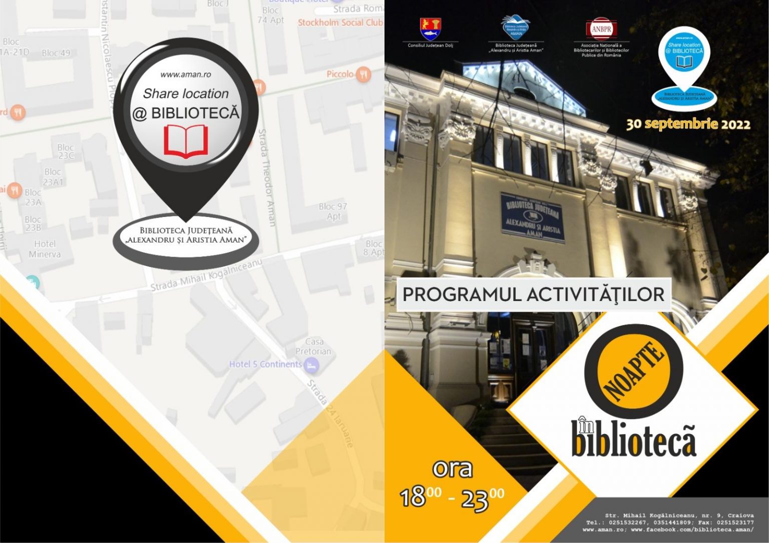 Până la miezul nopții, craiovenii vor participa la un adevărat maraton. Printre surprizele pregătite se află: numere de magie, ora de colorat, ateliere de pictură pe față, desene pe asfalt, hand-made, vizite si prezentări ale secțiilor bibliotecii, vizionări de filme, o cabina foto pentru instantanee. Începând cu ora 21, craiovenii sunt invitați în curtea bibliotecii, la concertele oferite de trupele „Your Midwife On Ice” și „2NormaL”.
