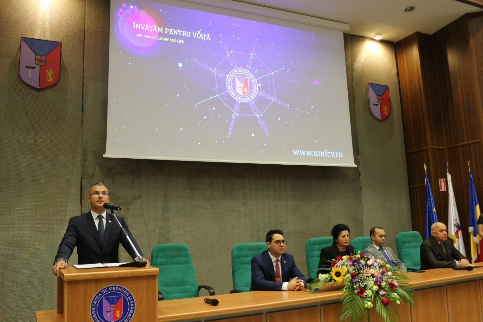 Suntem astăzi toți aici pentru că, indiferent de motivație, toți am ales să urmăm profesii medicale și dincolo de acestea, am ales ca drumurile noastre să se intersecteze. Eu și colegii mei am ales să fim și dascăli, iar voi, studenții, ne-ați ales pe noi, cei din acest centru universitar, să vă fim îndrumători. Vă mulțumim pentru votul de încredere acordat și vom încerca să ne ridicăm la înălțimea așteptărilor voastre”, a spus prof. univ. dr. Dan Ionuț Gheonea, rectorul UMF din Craiova.
