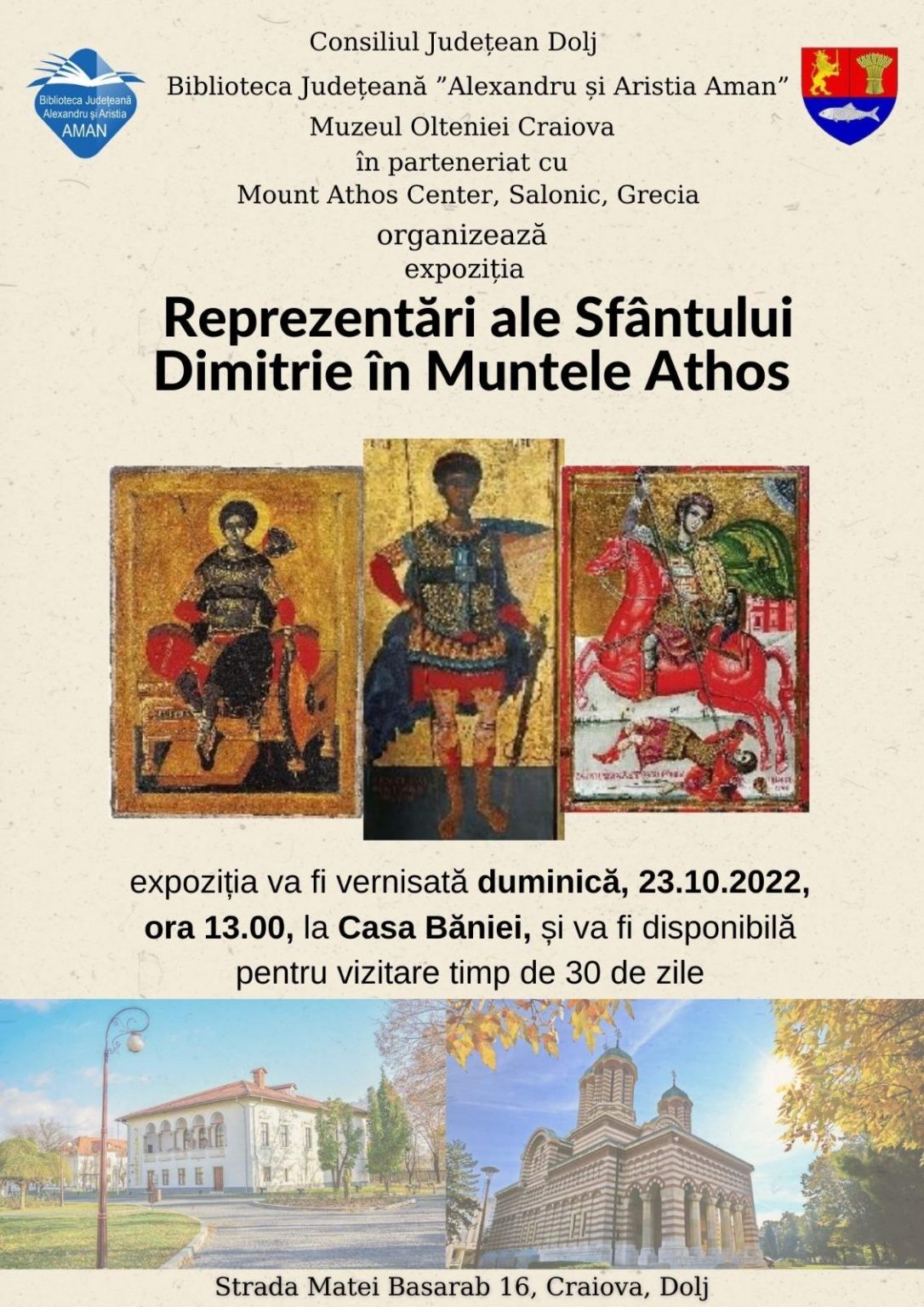 Biblioteca Județeană „Alexandru și Aristia Aman”, în parteneriat cu Muzeul Olteniei Craiova și „Mount Athos Center”, Salonic, Grecia, organizează duminică, 23 octombrie 2022, ora 13.00, la Casa Băniei, vernisajul expoziției „Reprezentări ale Sfântului Dimitrie în Muntele Athos
