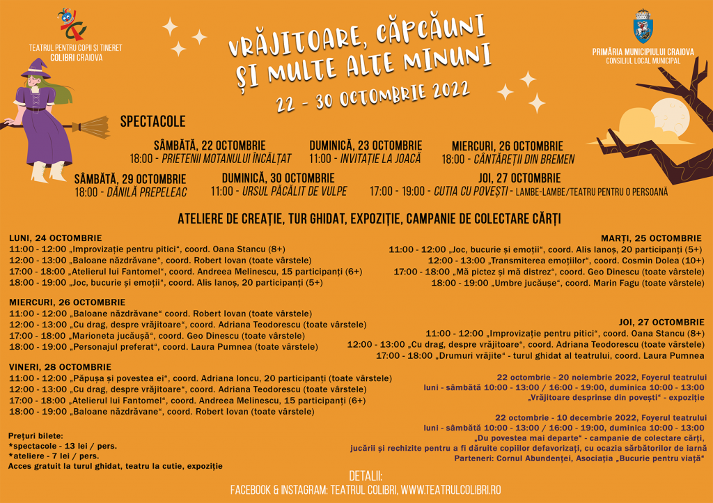 Teatrul pentru copii și tineret Colibri ne propune o vacanță creativă, plină cu surprize. Timp de 9 zile, în perioada 22 – 30 octombrie 2022, în Fabrica de povești vor fi spectacole, ateliere de creație pentru toate vârstele, o zi de călătorie prin culisele teatrului, va fi vernisată expoziția „Vrăjitoare desprinse din povești“ și se va da startul campaniei „Du povestea mai departe“ – campanie de colectare cărți, jucării și rechizite pentru a fi dăruite copiilor defavorizați, cu ocazia sărbătorilor de iarnă.