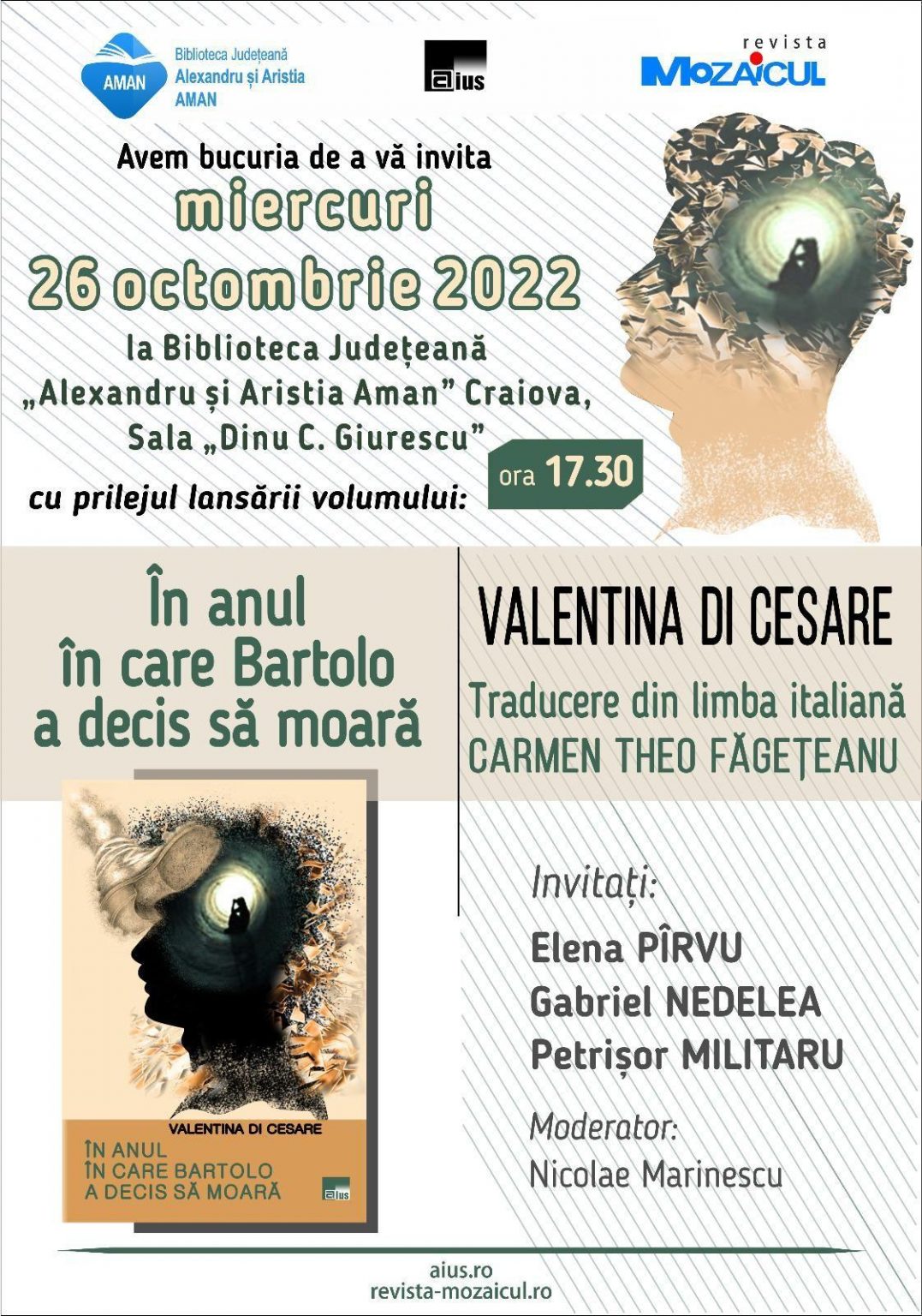 Volumul „În anul în care Bartolo a decis să moară”, autor Valentina di Cesare, volum tradus în limba română de Carmen Theo Făgețeanu, va fi lansat miercuri, 26 octombrie, începând cu ora 17.30, în sala „Acad. Dinu C. Giurescu”, la Biblioteca Județeană.