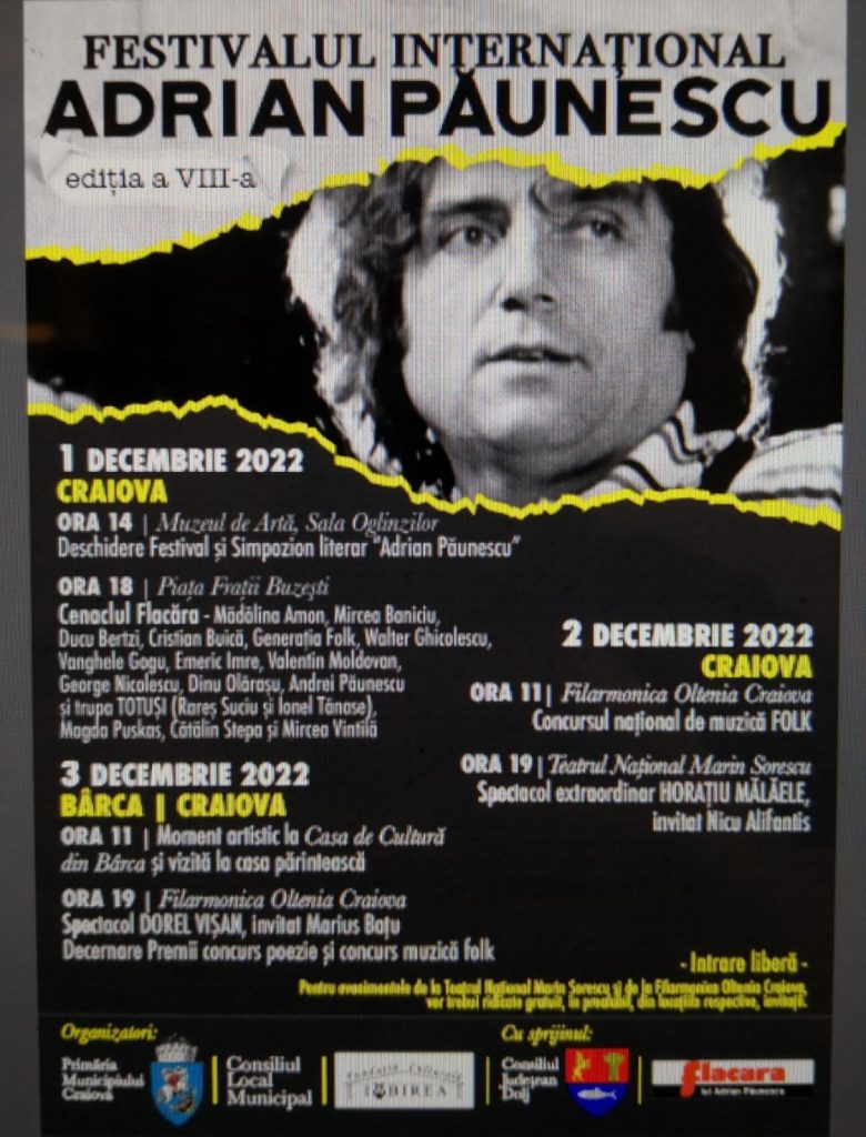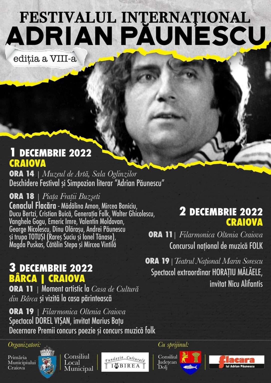 În perioada 1-3 decembrie 2022 are loc, la Craiova, cea de-a VIII-a ediţie a Festivalului Internaţional Adrian Păunescu.