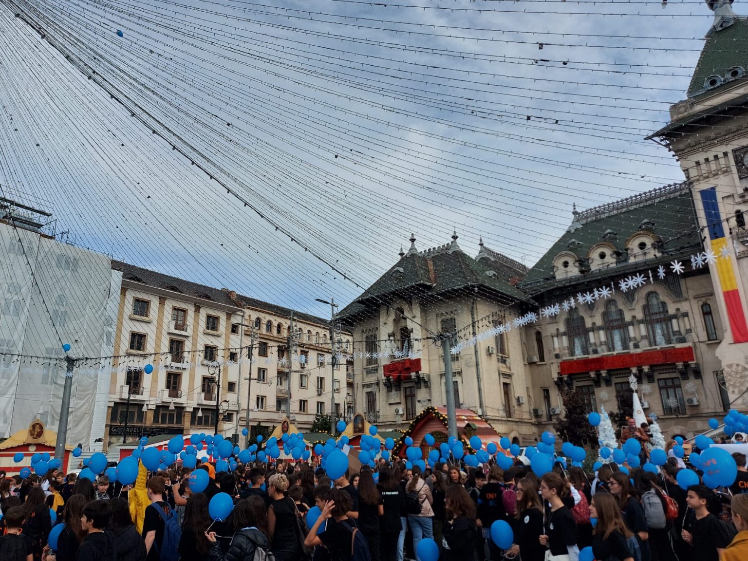 Piața Mihai Viteazul a fost colorată în albastru de elevii Colegiului Național Frații Buzești. Acest lucru s-a întâmplat după ce reprezentanții Primăriei Craiova au eliberat zona la limită, cu doar câteva minute înainte ca tinerii să își facă apariția. Autoritățile locale montau la căsuțele tematice pentru Târgul de Crăciun și meșterii au fost nevoiți să își dea programul peste cap, să mute utilajele, căsuțele și muncitorii, pentru a le face suficient loc elevilor care veneau în centrul orașului pentru a sărbători.