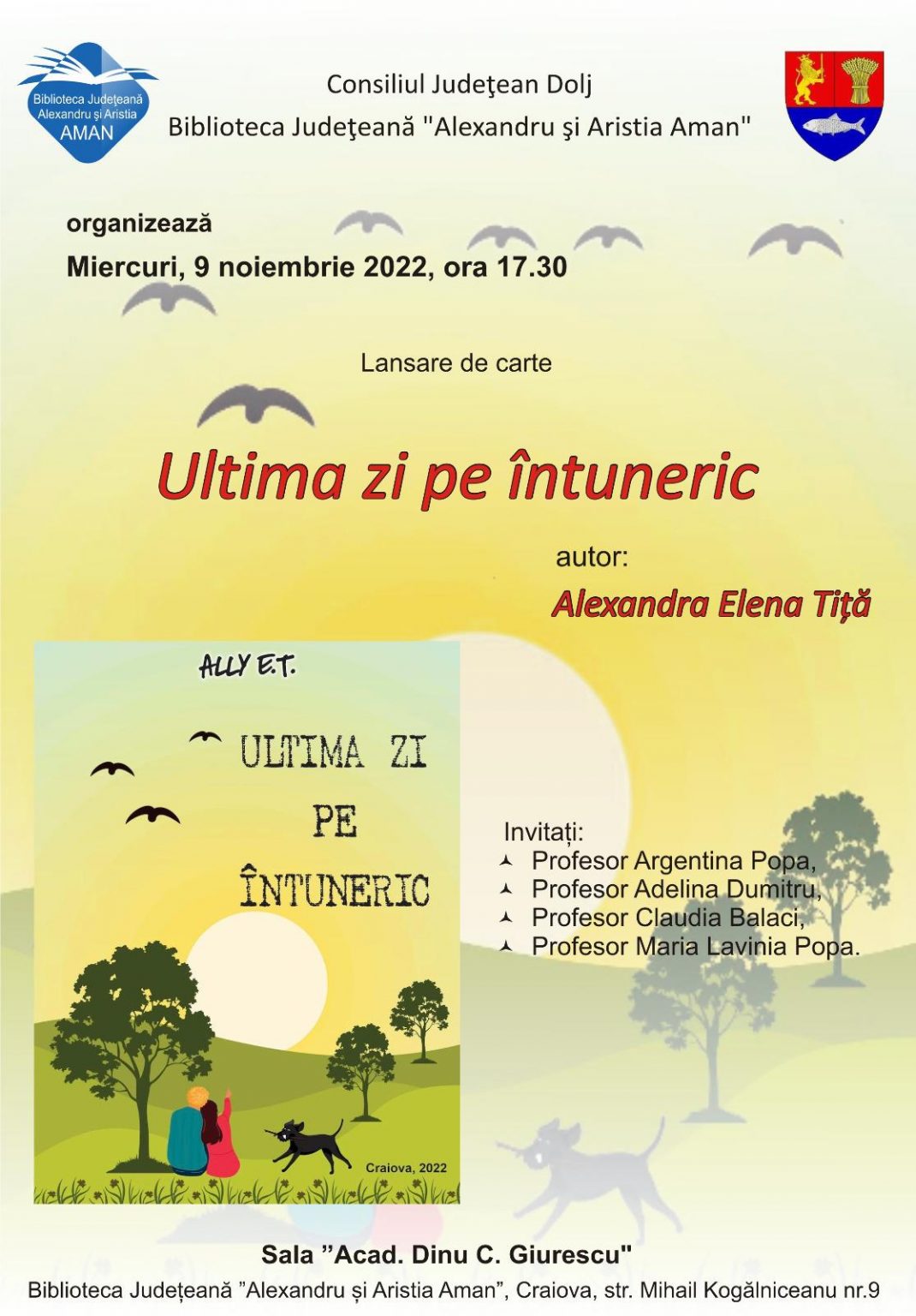 Volumul „Ultima zi pe întuneric”, de Alexandra Elena Tiță, va fi lansat miercuri, 9 noiembrie 2022, începând cu ora 17.30, în sala „Acad. Dinu C. Giurescu”.