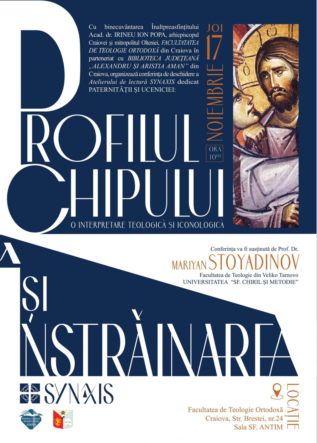 Conferința ”Profilul chipului și înstrăinarea. O interpretare teologică și icologică” marchează deschiderea Atelierului de lectură Synaxis, dedicat Paternității și Uceniciei și este organizată cu binecuvântarea Înaltpreasfințitului Acad. dr. Irineu Ion Popa, arhiepiscopul Craiovei și mitropolitul Olteniei.