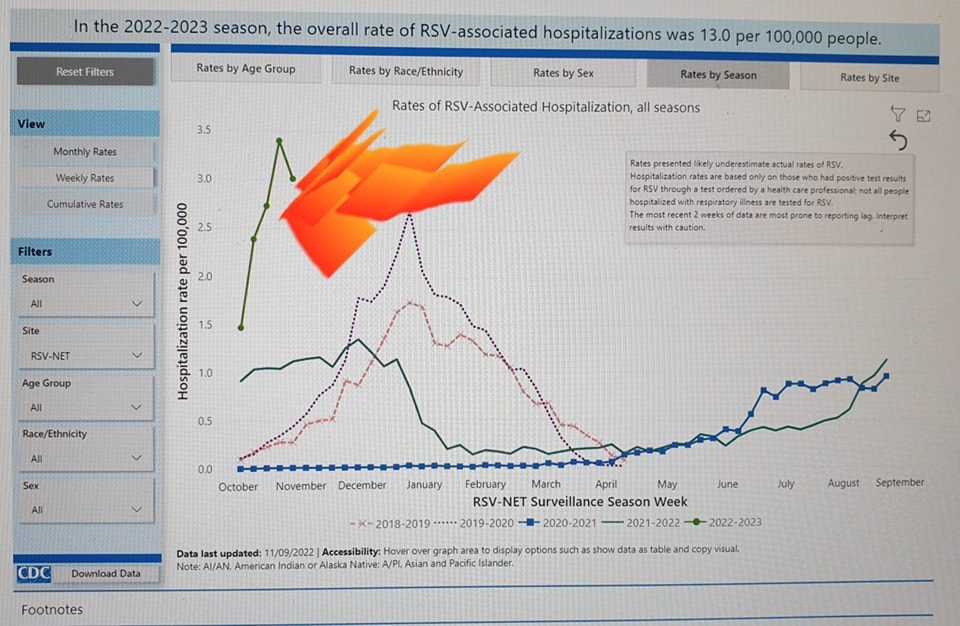 Priviți ratele de spitalizare, în ultimii ani, în SUA, conform CDC, în imaginea de mai jos. Curba verde, cu buline, este anul acesta. A început mult mai repede și a urcat mult mai abrupt. https://www.news-medical.net/…/Surge-in-RSV-cases…