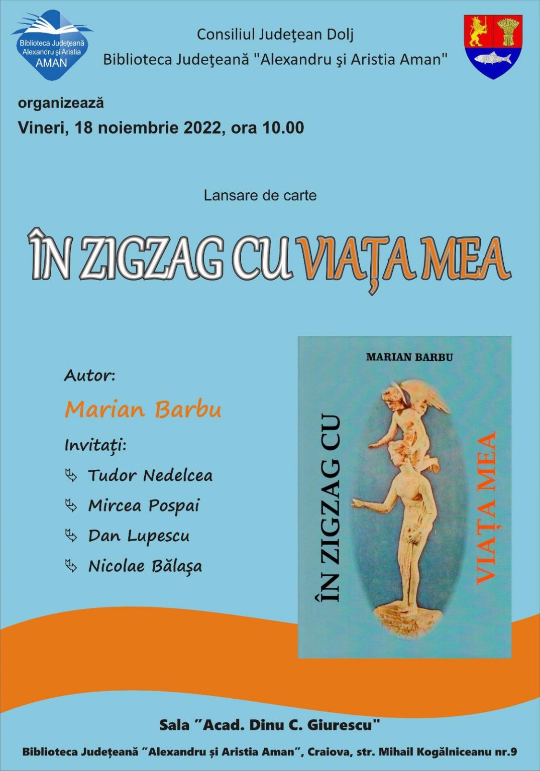 Volumul „În zigzag cu viața mea”, de Marian Barbu, va fi lansat vineri, 18 noiembrie 2022, în sala „Acad. Dinu C. Giurescu”, începând cu ora 10.00, la Biblioteca Județeană „Alexandru și Aristia Aman”. La eveniment vor participa invitații: Tudor Nedelcea, Mircea Pospai, Dan Lupescu, Nicolae Bălașa.