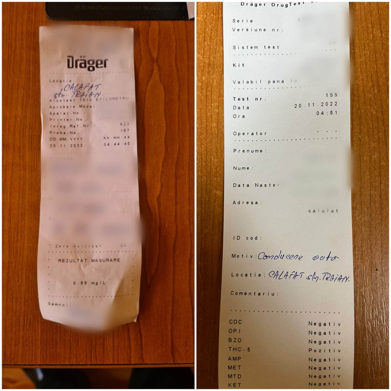”În noaptea de 19/20 noiembrie a.c., ora 04.30, polițiști din cadrul Poliţiei Municipiului Calafat au depistat un tânăr de 30 ani, din municipiul Calafat, în timp ce conducea un autoturism pe strada Traian, din localitate. Conducătorul auto a fost testat cu aparatul etilotest, rezultatul fiind de 0,99 mg/l alcool pur în aerul expirat, dar şi cu aparatul drugtest, rezultatul fiind pozitiv pentru substanța cannabis”, potrivit comunicatului IPJ Dolj.