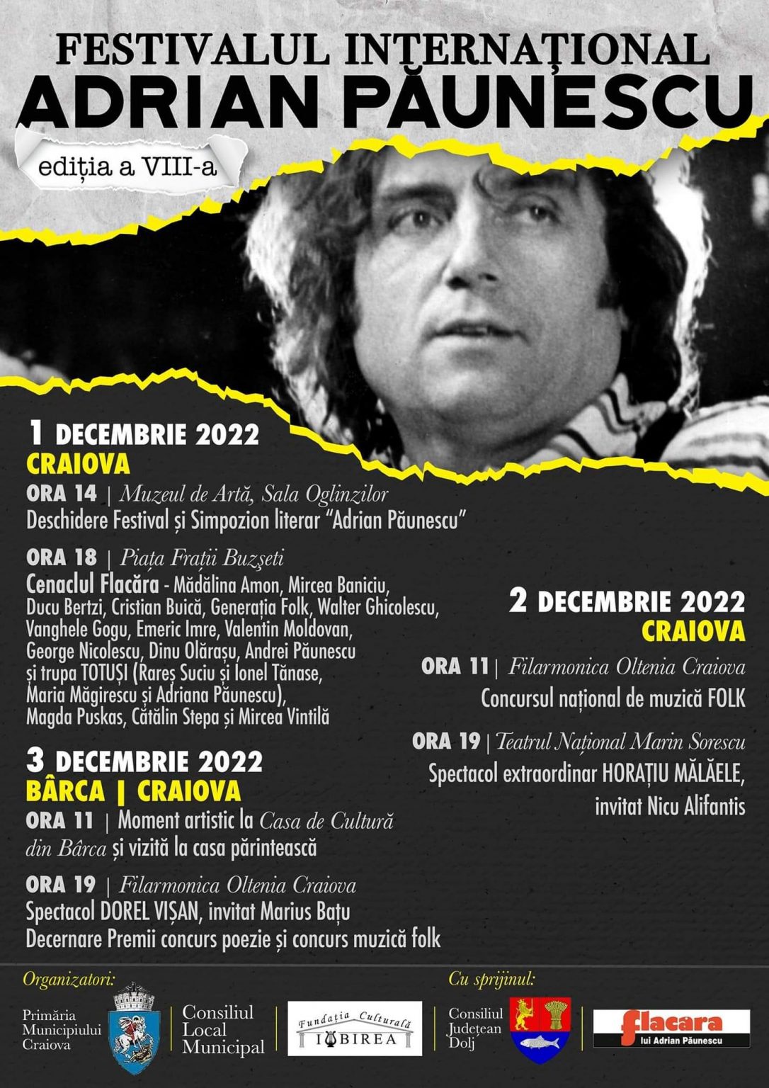 Muzica și poezia își dau, din nou, întâlnire la Craiova, la început de decembrie. Cei mai îndrăgiți artiști folk din țară deschid joi, 1 decembrie 2022, cea de-a VIII-a ediție a Festivalului Internațional Adrian Păunescu.