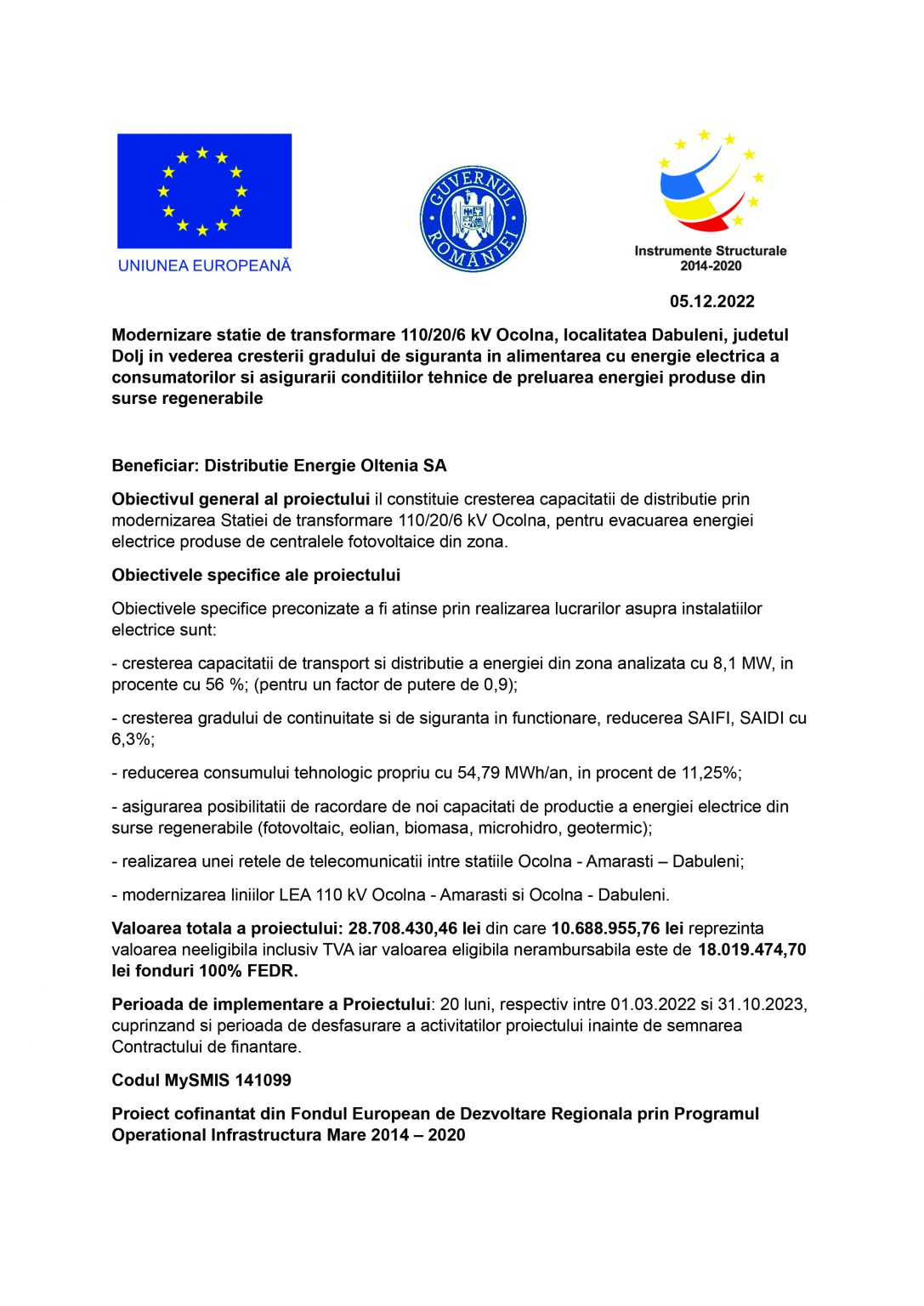Modernizare statie de transformare 110/20/6 kV Ocolna, localitatea Dabuleni, judetul Dolj in vederea cresterii gradului de siguranta in alimentarea cu energie electrica a consumatorilor si asigurarii conditiilor tehnice de preluarea energiei produse din surse regenerabile