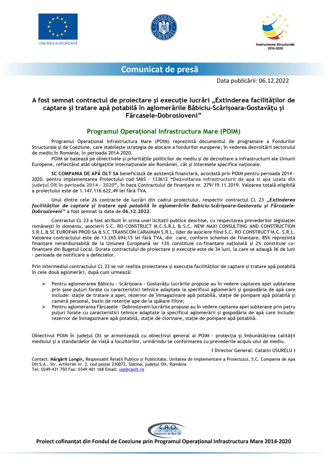 EconomieOltA fost semnat contractul de proiectare și execuție lucrări „Extinderea facilităților de captare și tratare apă potabilă în aglomerările Băbiciu-Scărișoara-Gostavățu și Fărcașele-Dobrosloveni Jurnalul Olteniei 6 decembrie 2022 Share SHARE Jurnalul Olteniei See Full Bio Distribuie acest articol Facebook Whatsapp Whatsapp Email Copy Link Print Articolul precedent Râmnicu Vâlcea. Primarul a oferit cadouri celor mici Articolul următor Ajutor de peste 300 euro de la stat pentru români. Cine se califică Ultima ora Se știe grupa în care poate juca România la Cupa Mondială din 2026 5 decembrie 2025 Dolj: Ajutoare sociale de peste 76 milioane lei 5 decembrie 2025 Cea de-a VII-a ediție a Semimaratonului Craiovei a avut loc sâmbătă, 18 octombrie 2025. 5 decembrie 2025 ANUNT PRIVIND ORGANIZAREA ACHIZITIEI DE UTILAJE . MINIEXCAVATOR – LOTUL 1, UTILAJ DE FORAT HIDRAULIC – LOTUL 2 – RELUATÃ 2 5 decembrie 2025 Modernizarea CF Filiași: Începe proiectarea 5 decembrie 2025 Testare gratuită HPV la Spitalul Județean Târgu Jiu 5 decembrie 2025 CE Oltenia raportează emisii scăzute de dioxid de carbon 5 decembrie 2025 DIICOT a destructurat un grup de proxenetism în Mehedinți 5 decembrie 2025 Legea pensiilor magistraților, atacată, din nou, la CCR 5 decembrie 2025 Magia Crăciunului Târgu Jiu: Seară de neuitat 5 decembrie 2025