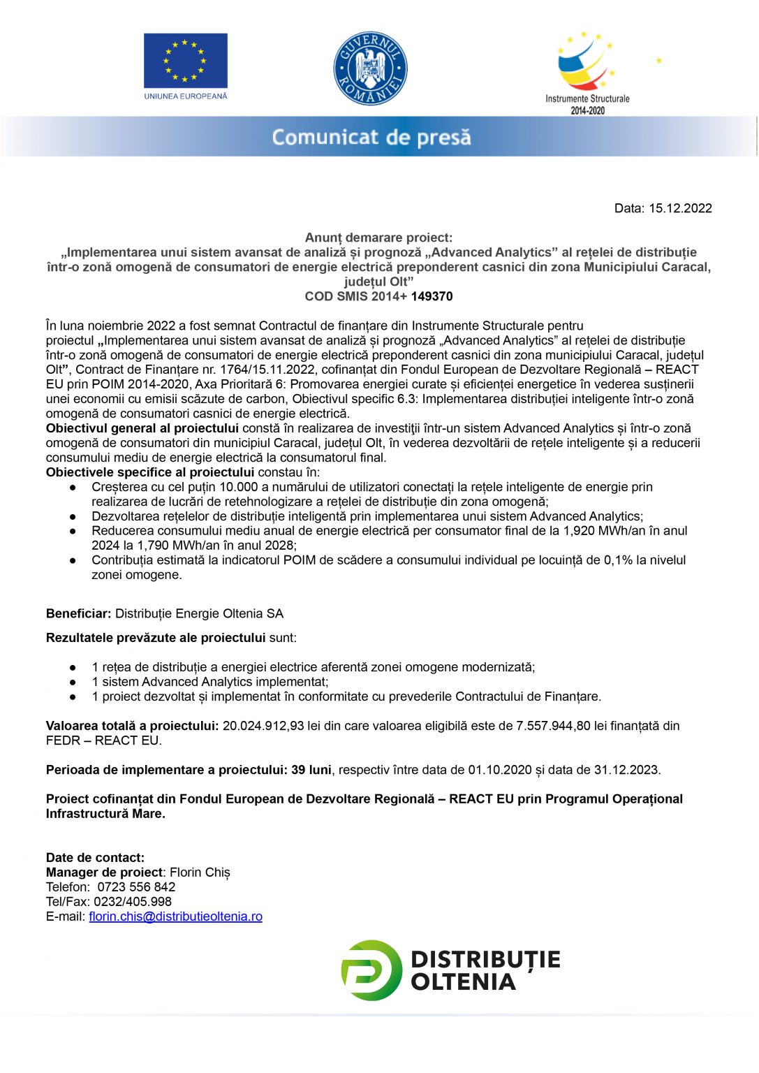 „Implementarea unui sistem avansat de analiză și prognoză „Advanced Analytics” al rețelei de distribuție într-o zonă omogenă de consumatori de energie electrică preponderent casnici din zona Municipiului Caracal, județul Olt”