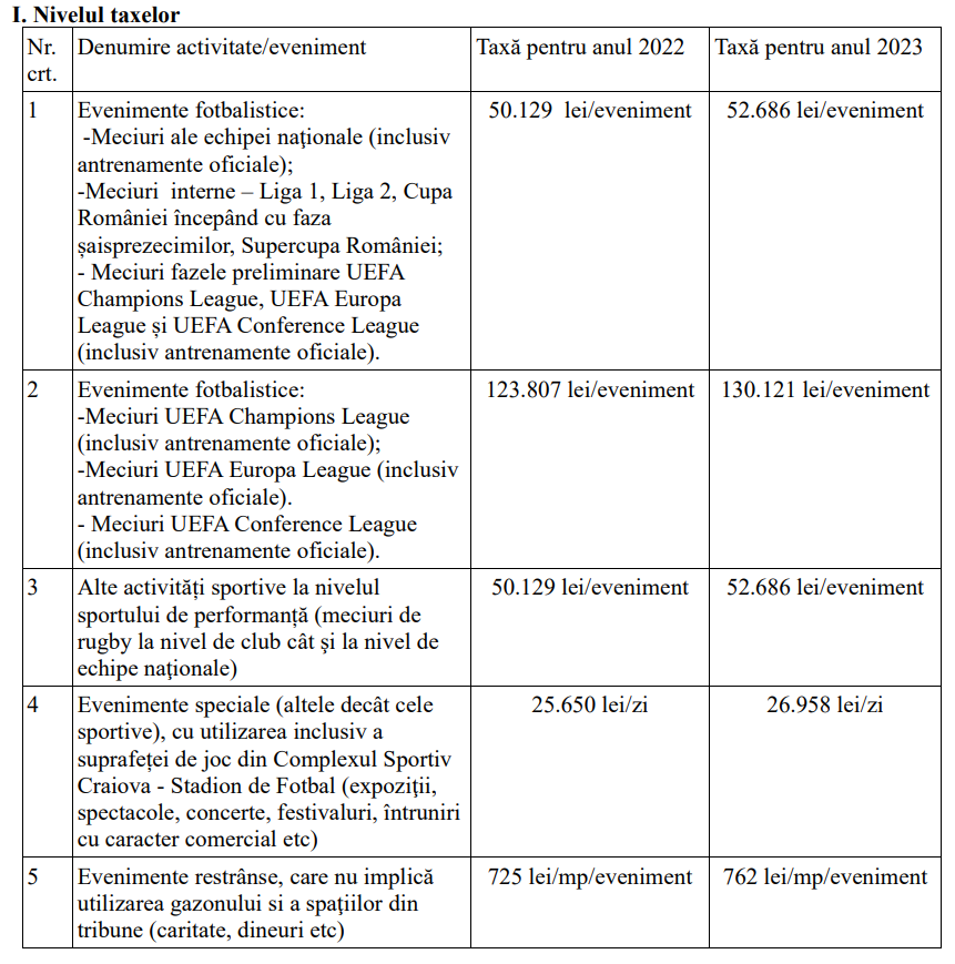Totodată, echipele de fotbal din Craiova vor plăti și ele chirii mai mari pentru a folosi stadionul „Ion Oblemenco”. Cu 2.557 de lei mai mult vor fi nevoite CSU și FCU Craiova să plătească pentru o partidă disputată pe teren propriu, în 2023, suma fiind mai mare pentru meciurile din fazele superioare ale cupelor europene.