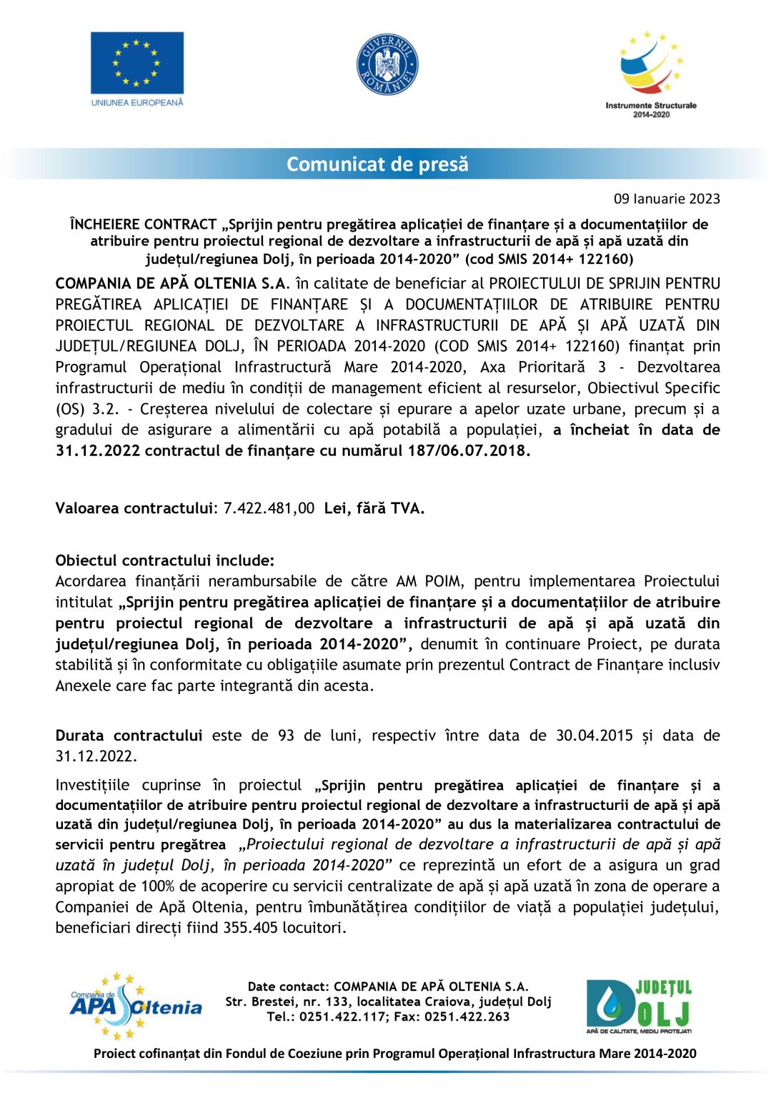 Încheiere contract „Sprijin pentru pregătirea aplicației de finanțare și a documentațiilor de atribuire pentru proiectul regional de dezvoltare a infrastructurii de apă și apă uzată din județul/regiunea Dolj, în perioada 2014-2020” (cod SMIS 2014+ 122160)