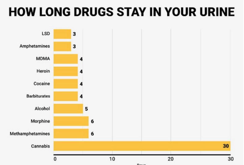 În cazul urinei, lucrurile stau puțin diferit. LSD-ul și amfetaminele rămân în urină trei zile, heroina și cocaina patru zile, în timp ce morfina și metamfetaminele șase zile. Marijuana este o excepție, rămânând în urină în jur de 30 de zile. Dacă vrei să vezi cum stă situația în cazul fiecărui drog, te poți uita pe acest tabel: