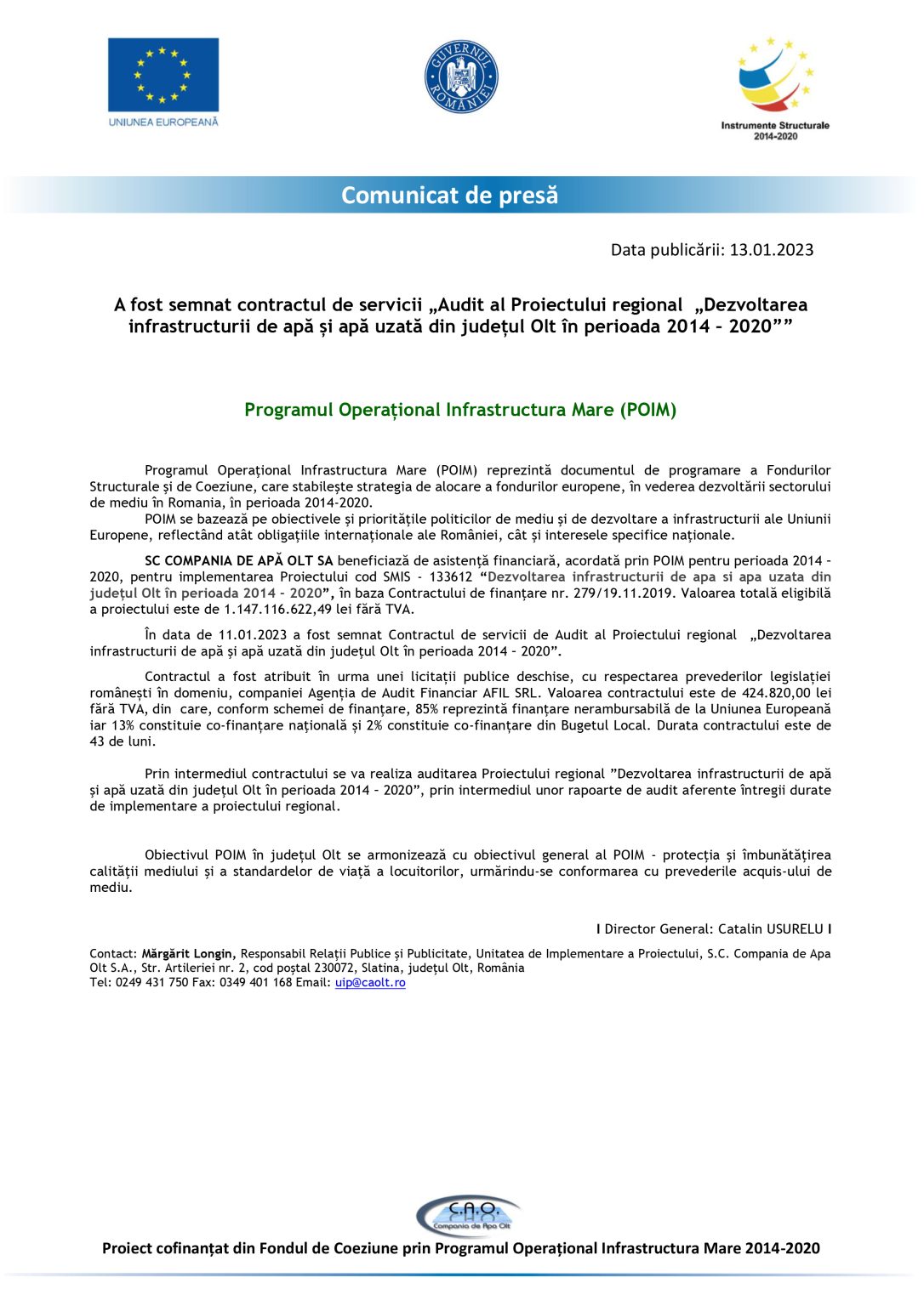 EconomieOltA fost semnat contractul de servicii „Audit al Proiectului regional „Dezvoltarea infrastructurii de apă și apă uzată din județul Olt în periada 2014-2020”” Jurnalul Olteniei 16 ianuarie 2023 Share SHARE Jurnalul Olteniei See Full Bio TAGGED:apaapa uzataauditcontract serviciiinfrastructurăproiect Distribuie acest articol Facebook Whatsapp Whatsapp Email Copy Link Print Articolul precedent Olt. Acțiuni pentru prevenirea accidentelor cu bicicliști, pietoni și căruțași Articolul următor Elevii din Cârcea au „Școală după Școală” Ultima ora Gorj: agresori reținuți și monitorizați electronic 5 decembrie 2025 Suspect de tentativă de agresiune reținut de Poliția Dolj 5 decembrie 2025 Locuință din Gorj cuprinsă de flăcări 5 decembrie 2025 Distribuție Oltenia: Oltenii, mai interesați de energie și sustenabilitate 5 decembrie 2025 Semimaratonul Craiovei 2025: Record de participanți 5 decembrie 2025 Sancțiuni de peste 40.000 lei și o activitate suspendată la Băbeni 5 decembrie 2025 Oltenia, sub cod galben de vânt. Avertizare ANM 5 decembrie 2025 Lansare proiect: „Împădurirea unui teren agricol în comuna Dobrești, beneficiar SEINEA ILEANA-MIHAELA „ 5 decembrie 2025 Flăcări în toiul nopții la Berislăvești! Pompierii vâlceni au salvat locuința cuprinsă de incendiu 5 decembrie 2025 Un fost jucător de la Universitatea Craiova, inclus în echipa lunii noiembrie, în Liga 2 5 decembrie 2025