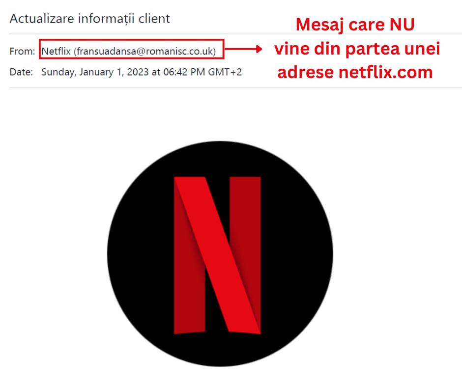 „Ai primit un e-mail, sau poate chiar un SMS de la Netflix, prin care eşti notificat că trebuie să-ţi ‘actualizezi informaţiile de client’? Ai grijă! În spatele iniţiativei sunt infractori cibernetici care vor să-ţi fure datele de autentificare. Textul în limba română este unul corect din punct de vedere gramatical, ceea ce, în lipsa unor verificări elementare, ar face ca un astfel de atac să aibă o rată de succes crescută”, arată reprezentanţii DNSC.